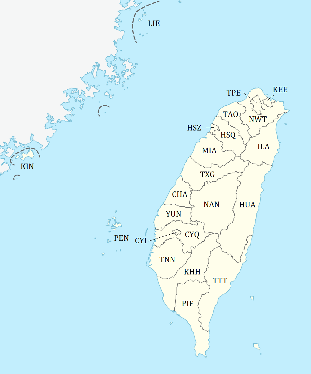 코드 | 명칭 | 중국어 | 대만어 (백화자) | 웨이드-자일스 표기법 | 영어 표기 |