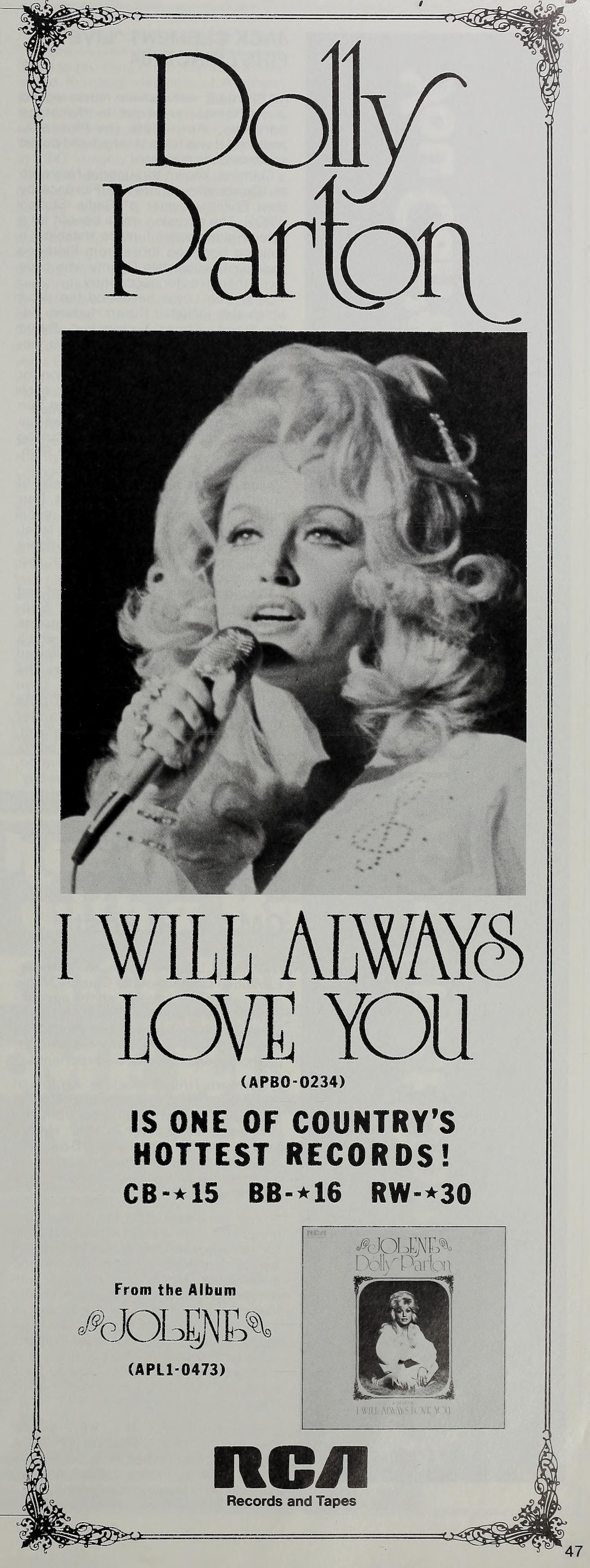 "I Will Always Love You"는 1974년 3월 18일에 파튼의 13번째 솔로 스튜디오 앨범인 ''졸린''(1974)의 두 번째 싱글로 발매되었다.[25] 1974년 오리지널 발매 당시 "I Will Always Love You"는 캐나다 ''RPM'' 컨트리 트랙 차트에서 4위에 올랐고, ''빌보드'' Hot Country Songs 차트에서 1위를 기록하며 1974년 가장 많이 팔린 싱글 중 하나가 되었다.[25]