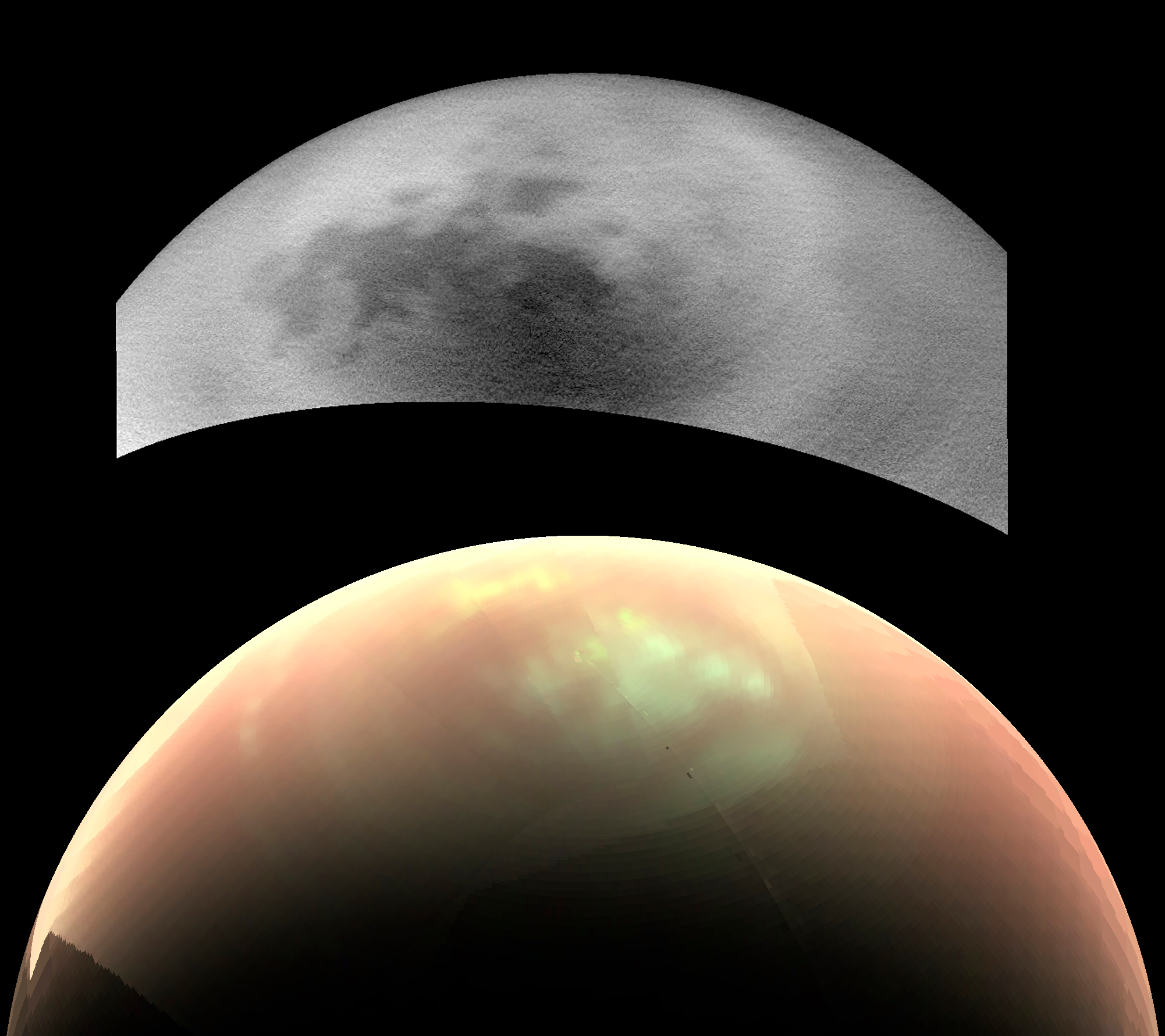 타이탄의 탄화수소 바다에서 반사되는 태양의 근적외선 방사선.