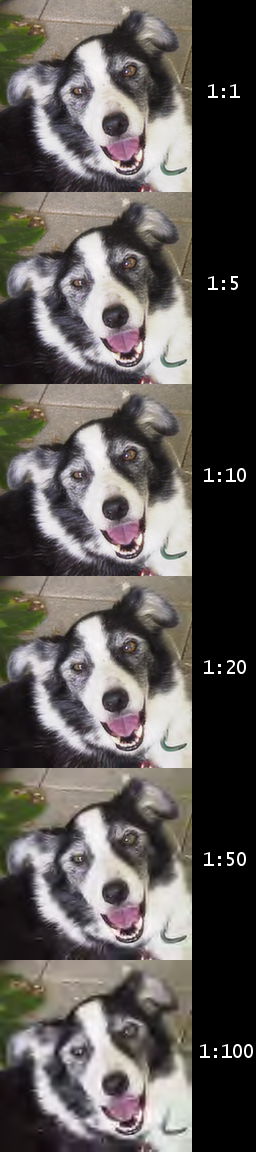 JPEG 2000 압축 인공물 시연. 숫자는 압축률을 나타냄.
