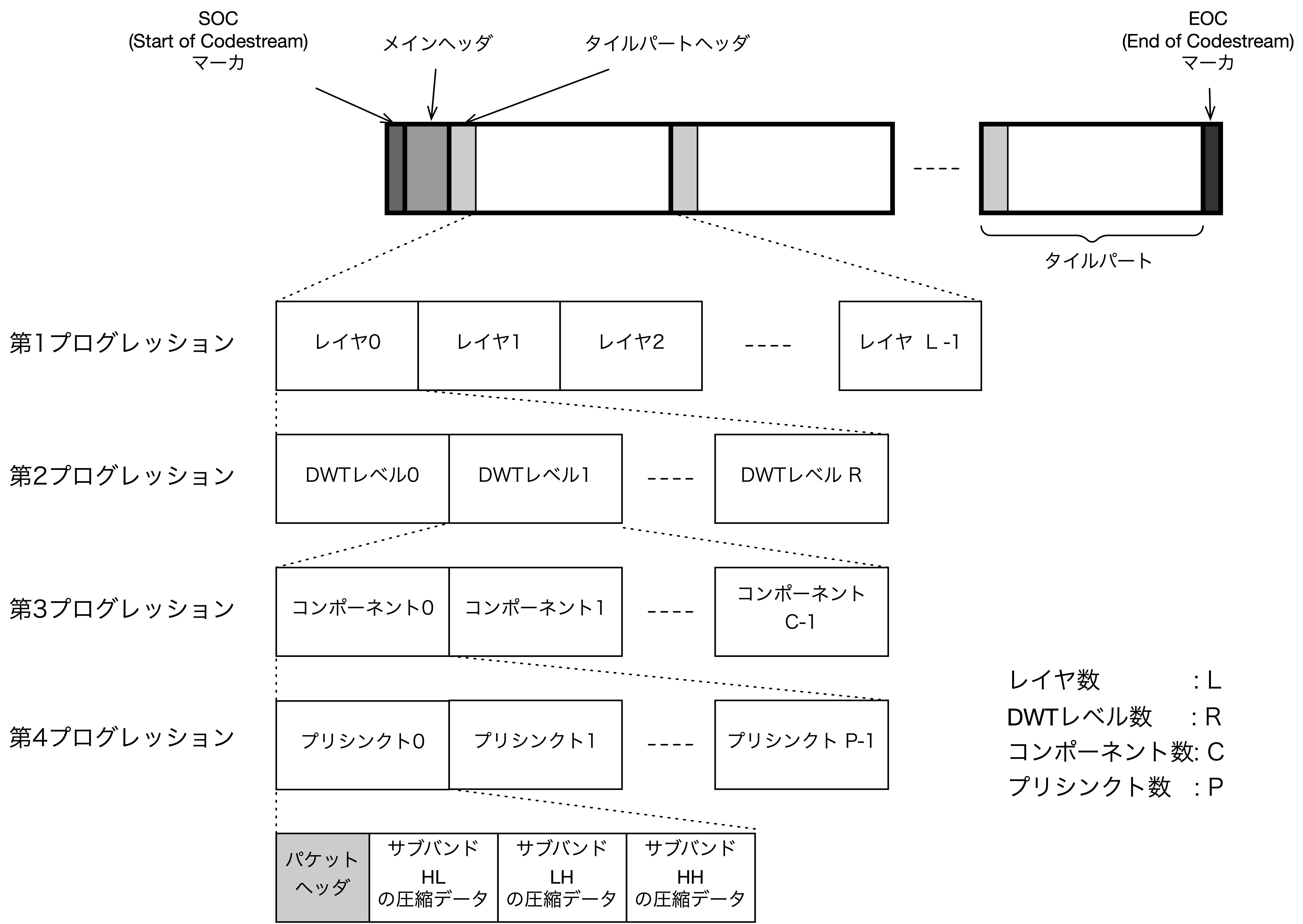 무손실 JPEG 표준처럼[9] JPEG 2000 표준은 단일 압축 아키텍처에서 무손실 압축과 손실 압축을 모두 제공한다. 무손실 압축은 가역 정수 웨이블릿 변환을 사용하여 구현된다. JPEG 2000은 매우 낮은 압축률부터 매우 높은 압축률까지, 매우 광범위한 유효 비트율을 처리할 수 있는 능력을 갖추고 있는데, 이는 JPEG 2000의 강점 중 하나이다. 압축 후 얻어지는 코드 스트림은 본질적으로 확장 가능(scalable)하며, 여러 방식으로 디코딩될 수 있다. 예를 들어, 코드 스트림을 임의의 지점에서 잘라내면 더 낮은 해상도나 신호 대 잡음비로 이미지 표현을 얻을 수 있다. 이는 JPEG 2000이 다중 해상도 분해 구조를 통해 이를 자동으로 수행하기 때문이다. 이러한 확장성 기능은 EBCOT(Embedded Block Coding with Optimized Truncation[76]) 알고리즘의 높은 부호화 효율과 PCRD-opt(Post Compression Rate Distortion Optimization) 등의 특징에 기인한다.