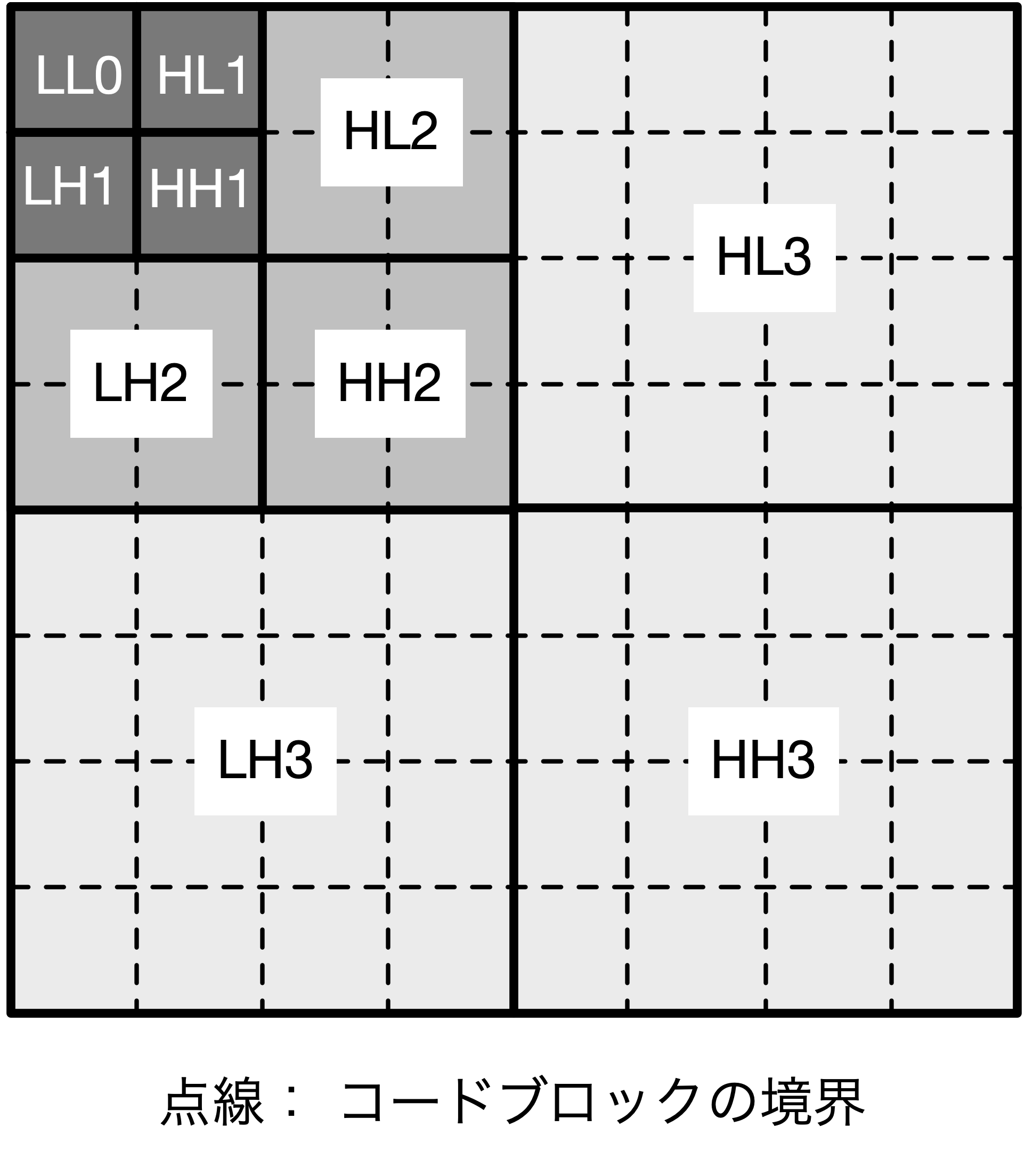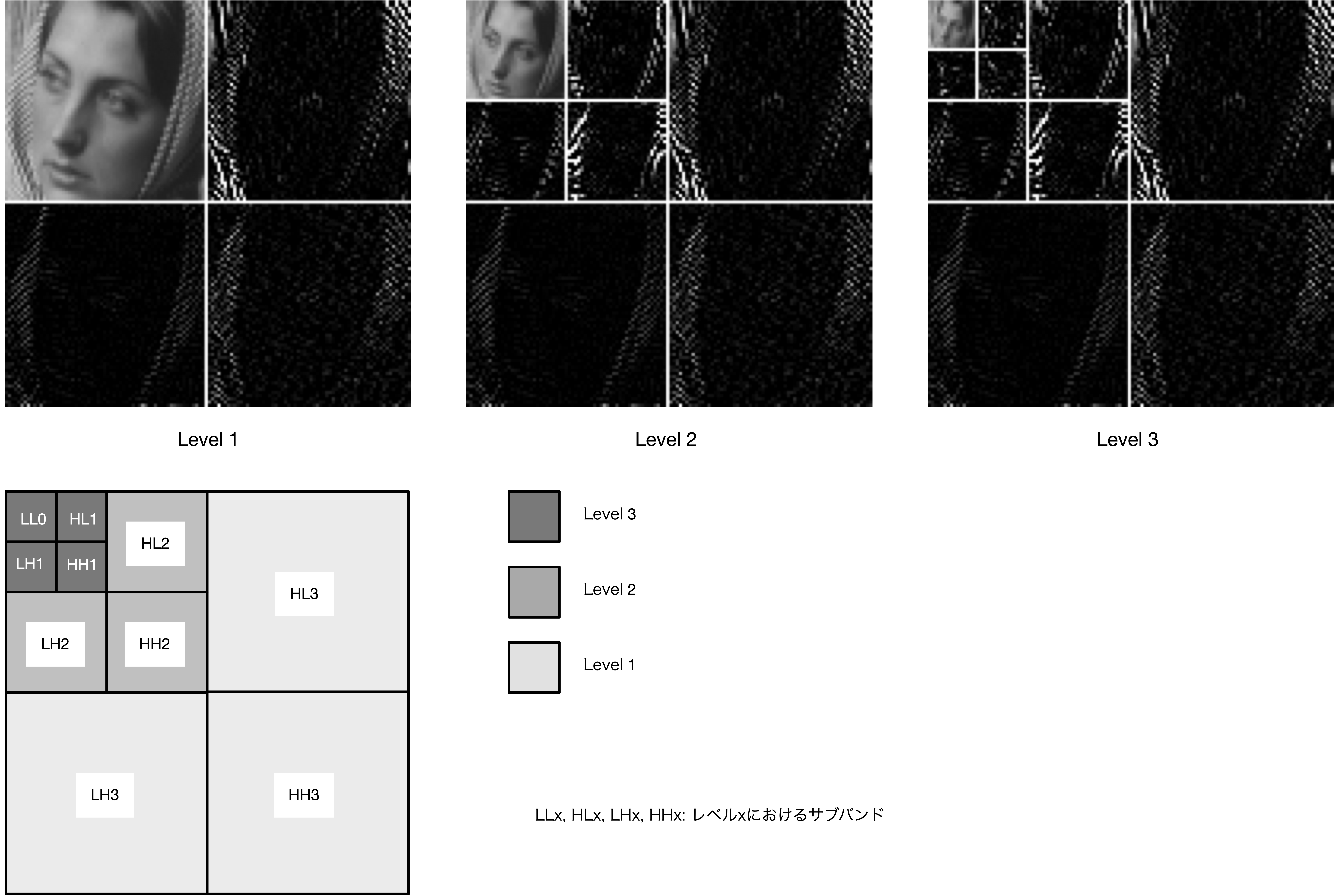 JPEG 2000에 사용되는 웨이블릿 변환의 예시. 이는 2단계 CDF 9/7 웨이블릿 변환이다.