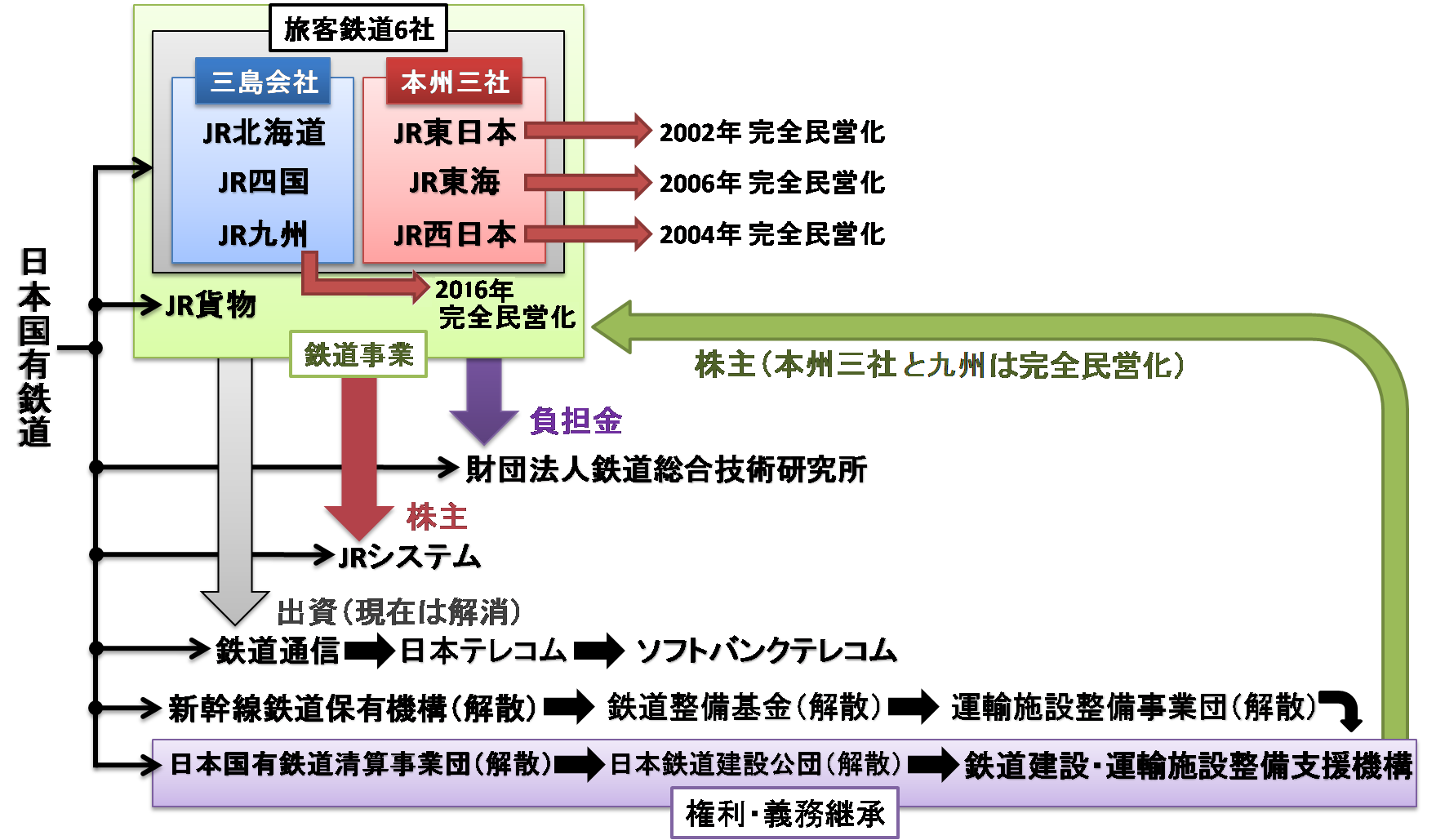 - 일본 철도건설·운수시설정비지원기구가 전 주식을 보유하는 특수 회사: JR 홋카이도, JR 시코쿠, JR 화물