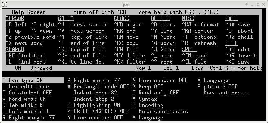 Joe's Own Editor(JOE)는 통합 도움말 시스템, 워드스타 및 터보 C와 유사한 키 시퀀스, 사용자 정의 가능한 설정 파일, 구문 강조 표시 등의 기능을 제공하는 텍스트 편집기이다. 하드 링크와 rc 파일을 통해 Emacs, Pico, WordStar의 키 바인딩을 에뮬레이션할 수 있으며, 명령줄에서 파일 편집을 제한하는 "rjoe" 변형도 존재한다. JOE는 DOS 편집기와 유사한 사용자 인터페이스를 가지면서도 명령 기록, 탭 완성, 정규 표현식 검색, 파이프 기능 등 유닉스 편집기의 특징을 포함한다. 1995년 Joseph Allen에 의해 개발이 중단되었다가 2001년 Marek Grac에 의해 재개되었으며, Allen은 2004년 구문 강조 및 UTF-8 지원을 추가한 버전 3.0을 출시했다.