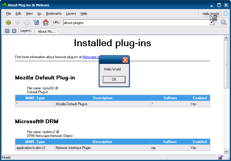 간단한 "Hello, World!" 프로그램을 K-멜레온의 매크로 언어로 작성하여 "Hello world!"라는 메시지가 있는 작은 창을 팝업시킬 수 있다.[62]