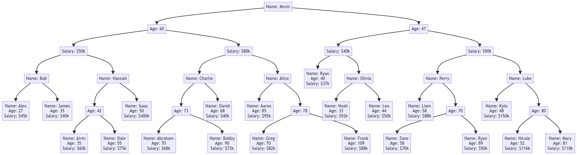 1. 탐색은 트리의 루트 노드에서 시작한다. 알고리즘은 새로운 점을 트리에 삽입할 때와 동일한 방식으로 트리를 따라 재귀적으로 내려간다. 즉, 각 노드에서 분할 기준이 되는 차원의 값을 비교하여, 검색 지점이 현재 노드의 값보다 작으면 왼쪽 자식 노드로, 크면 오른쪽 자식 노드로 이동한다.