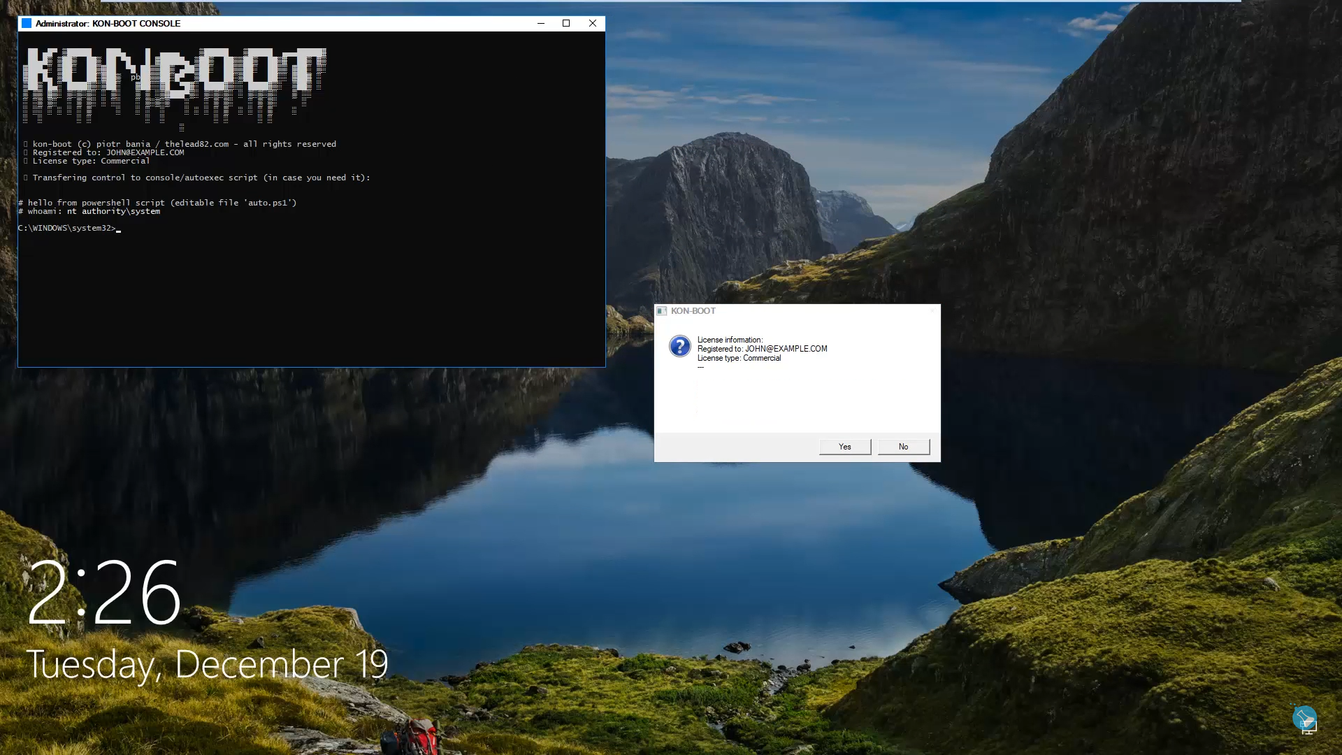 Kon-Boot는 내장된 고정 키[19] 기능으로 인해 Windows 암호를 변경할 수 있다. Kon-Boot로 Windows 부팅에 성공한 후 사용자는 SHIFT 키를 5번 누를 수 있으며, Kon-Boot는 로컬 시스템 권한으로 실행되는 Windows 콘솔 창을 연다.[20]이 콘솔은 다양한 목적으로 사용할 수 있는데, 예를 들어 Windows 암호를 변경하는 경우 `net user [사용자 이름] [새 암호]` 명령을 사용할 수 있다.[20] 선택한 사용자는 `net localgroup administrators [사용자 이름] /add` 명령을 입력하여 새 Windows 관리자로 추가할 수 있다. 마찬가지로 `net user [사용자 이름] *` 명령은[21] 선택한 사용자의 현재 Windows 암호를 지운다. Windows 콘솔이 시스템 권한으로 실행되므로 다른 많은 작업을 수행할 수 있다.