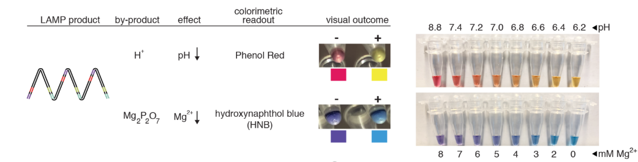 LAMP법은 DNA 증폭 시 발생하는 pH 변화 또는 Mg-피로인산염 침전 형성을 이용하여 색상 변화를 측정함으로써 결과를 확인할 수 있다.