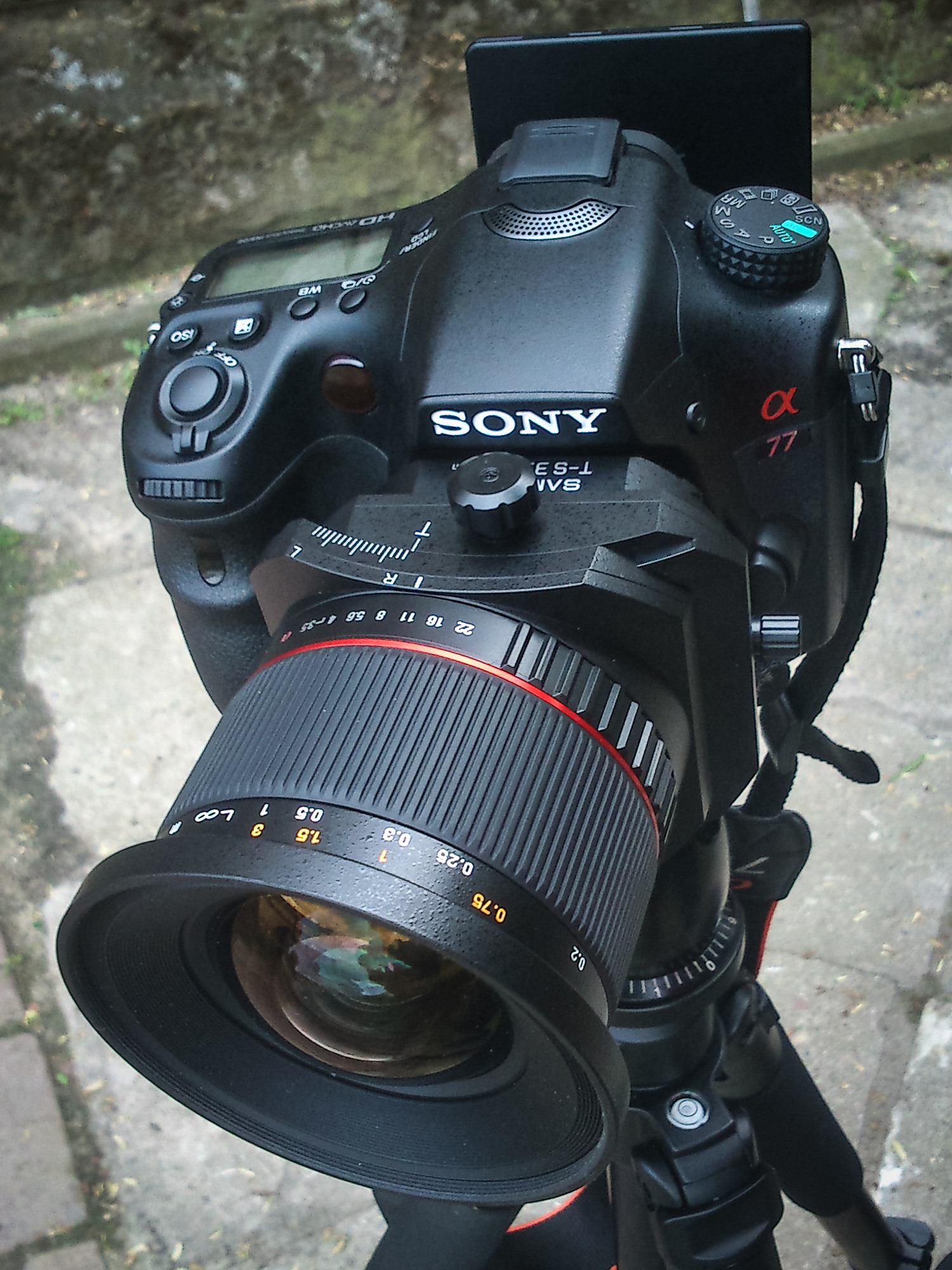 소니 알파 77에 마운트된 삼양 T-S 24mm f/3.5.