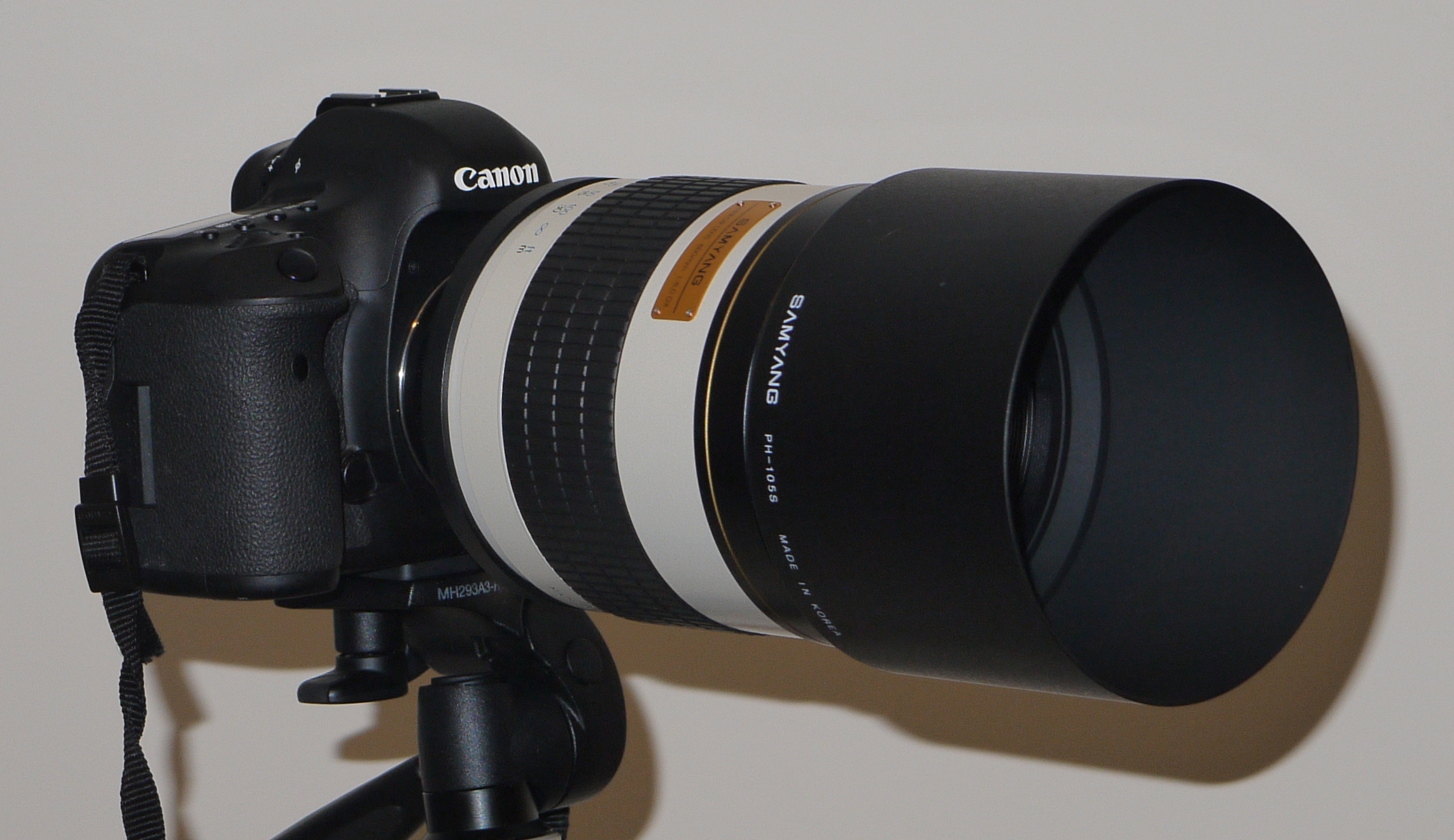 캐논 EOS 5D 마크 III에 마운트된 삼양 800mm f/8 미러 렌즈.