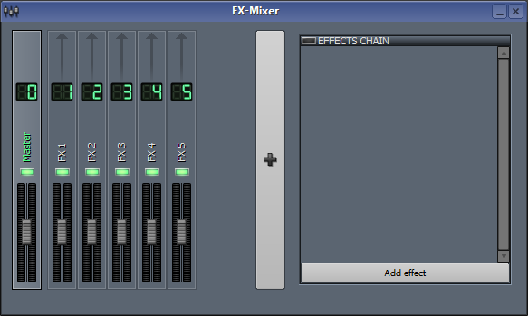 - FX 믹서: 오디오 레벨의 밸런스를 잡고, LADSPA 플러그인이나 VST 플러그인 등으로 이펙트를 부가할 때 사용한다. 최대 64채널까지 처리할 수 있으며, 1개의 채널당 여러 개의 플러그인을 연결할 수 있다. 또한 라우팅도 가능하며, 센드리버브나 트랙 복제와 같은 작업도 수행할 수 있다.