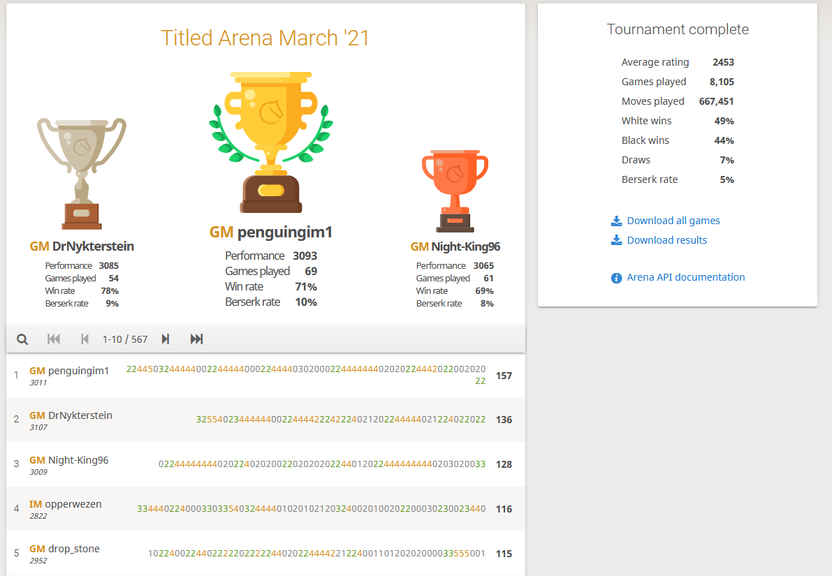 타이틀 아레나 (Titled Arenas)2017년부터 매월 상금이 걸린 타이틀 아레나를 개최하여 세계 정상급 선수들이 총알 체스와 블리츠 체스 실력을 겨룬다.[18] 체스 960 형식으로 진행되는 대회도 있다. 마그누스 칼센은 첫 번째 타이틀 아레나에서 우승한 이후 여러 차례 우승을 차지했으며,[19][20][21][22] 2022년 2월 기준 17번 우승으로 최다 우승 기록을 보유하고 있다.[23] 알리레자 피루자가 13번 우승으로 그 뒤를 잇고 있다.[23] 파비아노 카루아나, 막심 바시에-라그라브, 블라디미르 페도세예프 등 세계적인 선수들도 참가했다.