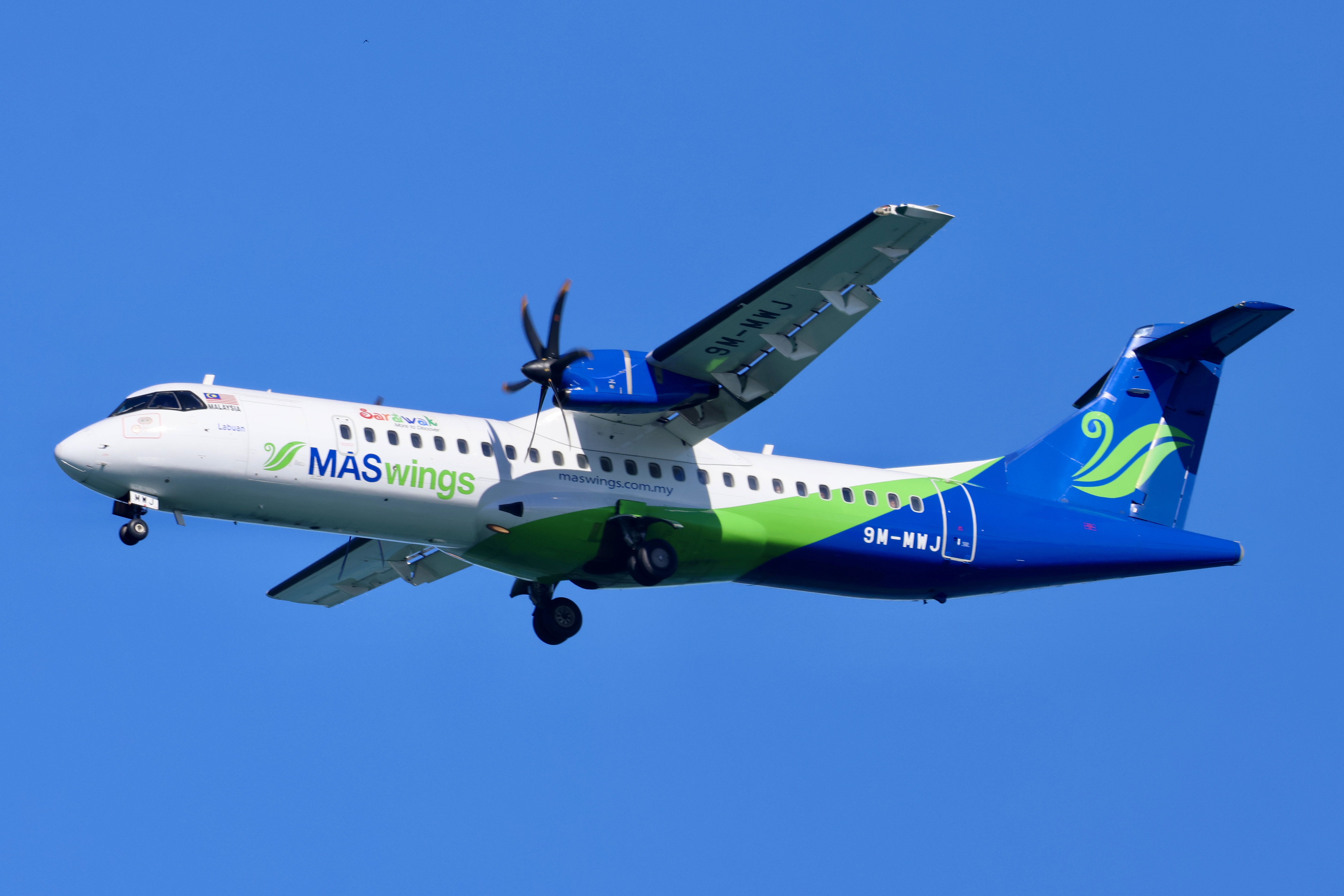 코타키나발루 국제공항 근처에서 비행 중인 MASwings ATR 72 항공기