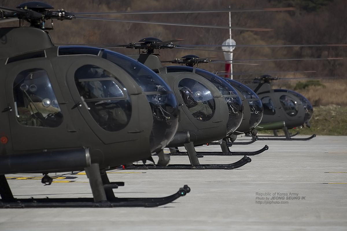 2012년 12월, 보잉대한민국 육군무인 리틀 버드를 시연하였다. 이 무인기는 향상된 ISR 및 보급과 같은 무인 기능 기술을 선보이기 위해 25분간 자율 비행을 시연했는데, 이는 육군 MD 500 헬리콥터에 통합될 수 있는 시스템이었다. 2015년 10월, 대한항공 항공우주사업본부(KAL-ASD)는 창문이 검게 칠해지고 후방 좌석 대신 4시간의 작전 지속 시간을 늘리는 대형 연료 탱크를 장착하고, 두 발의 헬파이어 미사일과 2.75인치(7070mm) 로켓 포드를 갖춘 무인 MD 500의 모형인 한국항공우주 수직 헬리콥터(KUS-VH)를 공개했다. 보잉의 선택적 유인 및 비무장 ULB와 달리 KUS-VH는 완전 무인이며, 무장되어 있고 EO/IR 센서도 갖추고 있다. KUS-VH는 ISR, 공격, 공중 투하, 해안 경비, 상륙 지원 및 유인 헬리콥터 부대를 지원하기 위한 비상 증원 임무를 수행할 것으로 예상된다. KUS-VH 부대는 2~4대의 항공기와 센서 패키지, 지상 통제 시스템 및 지상 지원 시스템으로 구성되며, 단독으로 또는 유인 공격 헬리콥터와 함께 운용할 수 있다. 2016~2017년에는 무인 정찰 헬리콥터에 대한 제안 요청이 있을 것으로 예상되며, 회사는 최대 175대의 MD 500을 무인화하는 것이 향후 10년 동안 퇴역 후 위험한 공격 임무를 안전하게 수행하기 위해 재사용하는 저렴한 방법이라고 밝혔다.[2]