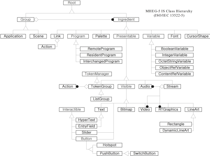 MHEG-5는 응용 프로그램 개발자가 이용 가능한 클래스 계층을 제공한다. 객체 지향 프로그래밍 언어와는 달리, 새로운 클래스를 정의할 수는 없다. 표준에서는 MHEG 응용 프로그램 표현을 텍스트 표현과 ASN.1을 이용한 표현, 두 가지로 정의한다. 응용 프로그램은 보통 텍스트 표현으로 작성되며, MHEG 엔진에 의해 ASN.1로 부호화된다.