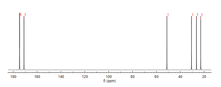 양성자 NMR 분광법과 마찬가지로 탄소-13 (13C) NMR 분광법은 분자 구조 결정에 사용되는 방법이다. 13C NMR은 특정 작용기에 해당하는 화학적 이동을 기반으로 분자에 존재하는 탄소의 유형을 나타낸다. ''N''-아세틸글루탐산은 3개의 카보닐 함유 치환기로 인해 카보닐 탄소를 가장 뚜렷하게 나타낸다.[35]