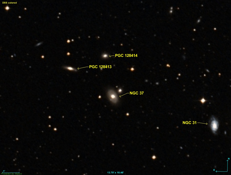 NGC 37은 소형 은하군 SCG2 0009-5713의 구성원이다. 이 은하군에는 나선 은하 PGC 128413, 렌즈형 은하 PGC 128414, PGC 95382가 포함되어 있으며, 적색편이는 약 0.031000이다.