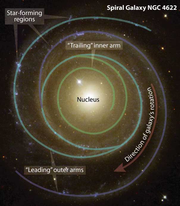 나선 은하 NGC 4622는 지구에서 약 1억 1,100만 광년 떨어진 센타우루스자리에 위치해 있다. NGC 4622는 선행 나선 팔을 가진 은하의 한 예이다.[2] 각 나선 팔은 은하 중심에서 멀어지며 특정 방향(팔에서 멀어지는 방향)을 "가리키는" 가장 바깥쪽 끝에서 끝난다. 나선 팔은 항상 후행할 것으로 생각되었는데, 이는 모든 나선 팔의 가장 바깥쪽 끝이 원반의 궤도 회전 방향에서 멀리 떨어져 있음을 의미한다. 이것은 NGC 4622의 ''안쪽'' 나선 팔에는 해당되지만, ''바깥쪽'' 나선 팔에는 해당되지 않는다. 대신, NGC 4622의 바깥쪽 팔은 선행 나선 팔이며, 이는 나선 팔의 끝이 원반 회전 방향을 가리킨다는 것을 의미한다. 이러한 현상은 NGC 4622와 다른 은하 사이의 중력 상호 작용 또는 NGC 4622와 더 작은 물체 사이의 병합의 결과일 수 있다.[2]