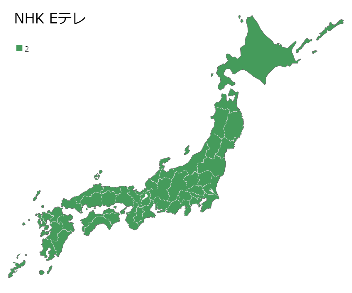 일본 전국방송으로 설립되었기 때문에 지역방송을 하지 않으며 한 방송국에서 여러 현을 방송구역으로 삼는 경우가 많아 종합 텔레비전보다 방송국 수가 적다.