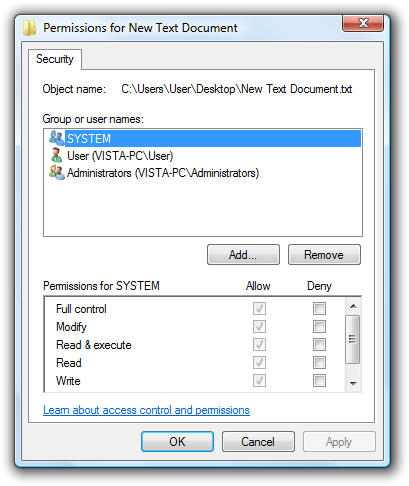 NTFS에서 각 파일 또는 폴더에는 소유자가 정의되고 두 개의 접근 제어 목록(ACL)이 포함된 보안 설명자가 할당된다. 첫 번째 ACL인 임의 접근 제어 목록(DACL)은 어떤 유형의 상호 작용(예: 읽기, 쓰기, 실행 또는 삭제)이 어떤 사용자 또는 사용자 그룹에 의해 허용되거나 금지되는지를 정확하게 정의한다. 예를 들어 `C:\Program Files` 폴더의 파일은 모든 사용자가 읽고 실행할 수 있지만 관리자 권한을 가진 사용자만 수정할 수 있다.[53]