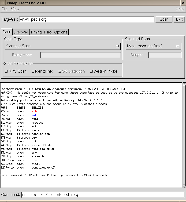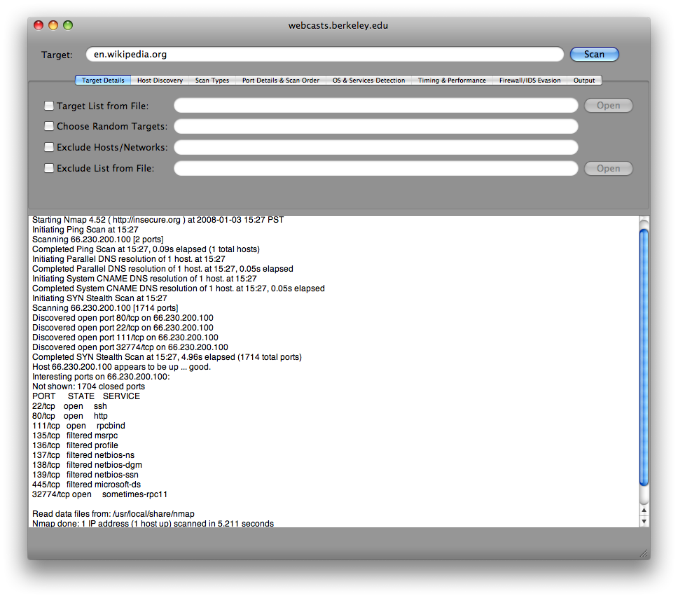 - 스크립트 기능: Nmap 스크립팅 엔진(NSE)[10] 및 Lua 프로그래밍 언어를 사용하여 대상과의 상호 작용을 스크립트화할 수 있다.[10]