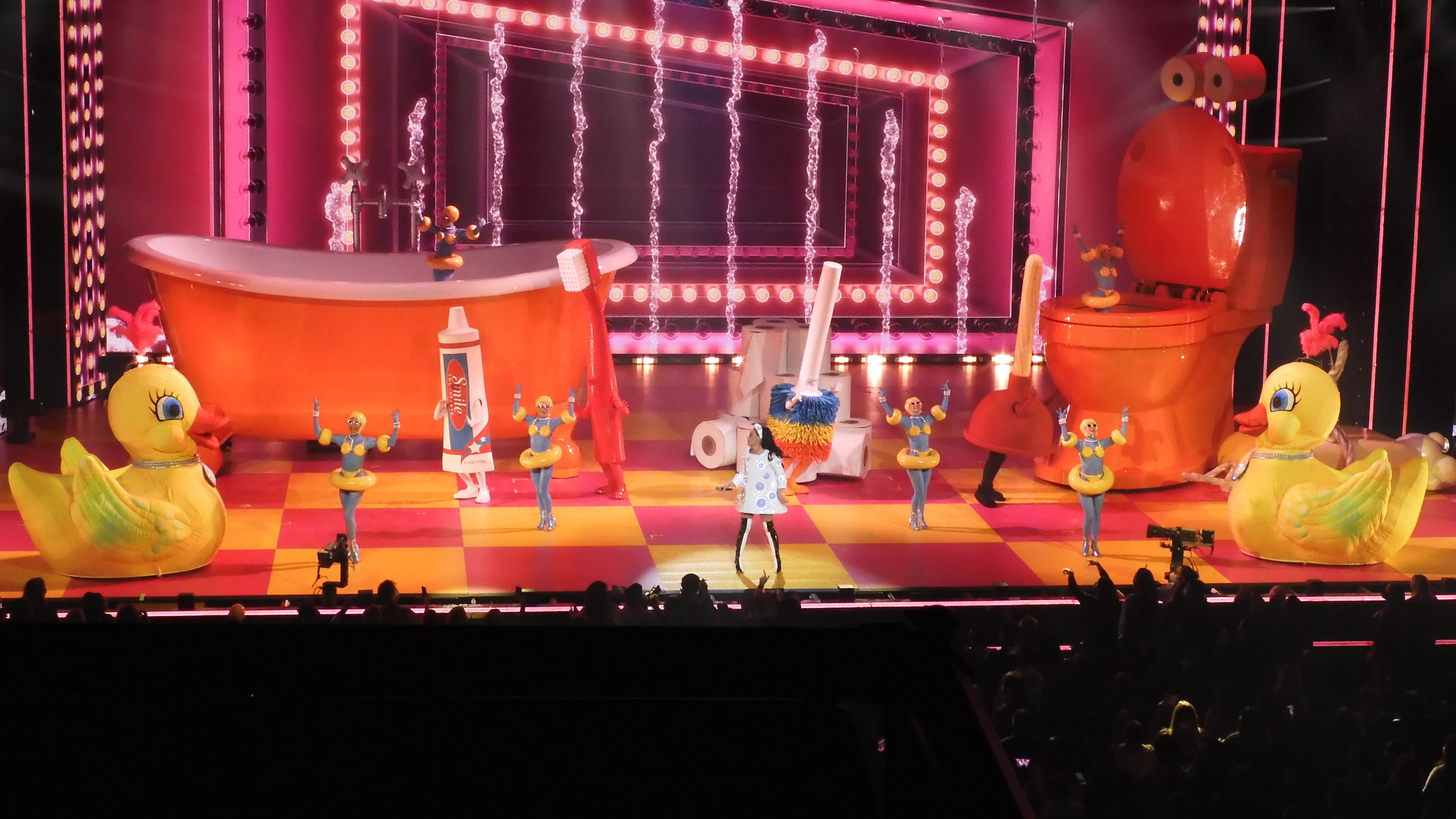 페리가 Play 레지던시 공연 중 "Waking Up in Vegas"를 부르고 있다.