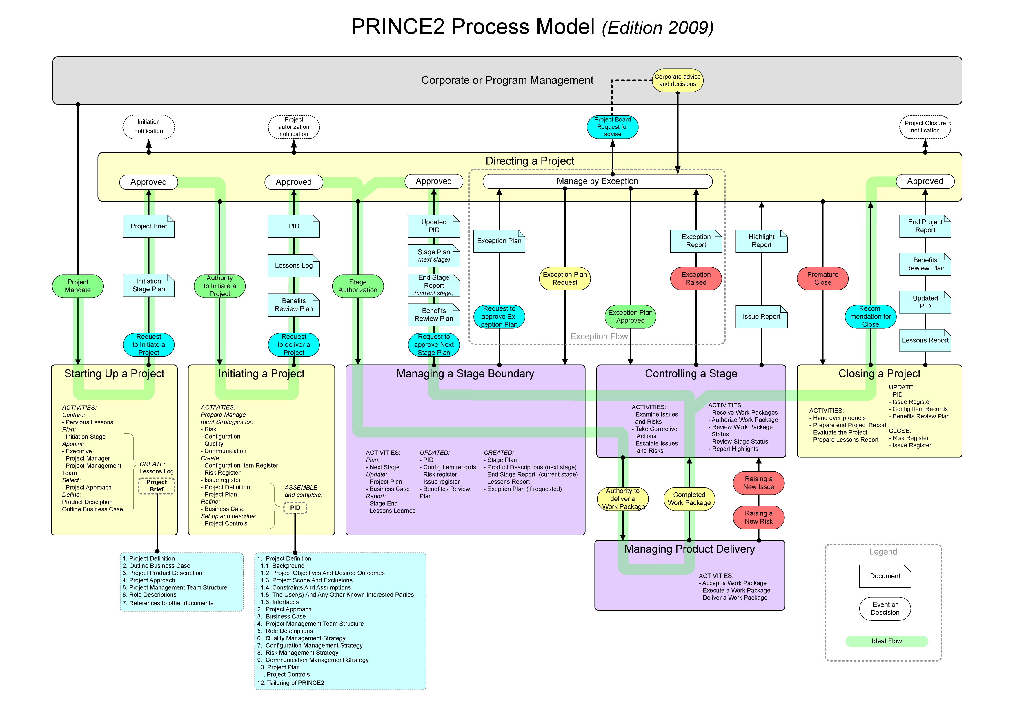 PRINCE2는 프로젝트 관리를 위한 방법으로, 7개의 프로세스로 구성된다. 이 프로세스들은 프로젝트의 시작부터 종료까지 수행되는 활동들을 단계별로 나타낸다.[39]- 프로젝트 시작 (Starting Up a project): 프로젝트 팀을 임명하고, 임원 및 프로젝트 관리자를 포함하여 프로젝트 개요를 작성한다.