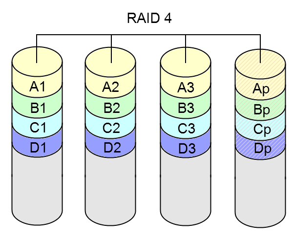- '''RAID 3''' 및 '''RAID 4''': 전용 패리티 디스크를 사용하여 데이터를 스트리핑한다. RAID 3은 바이트 단위, RAID 4는 블록 단위로 스트리핑한다.