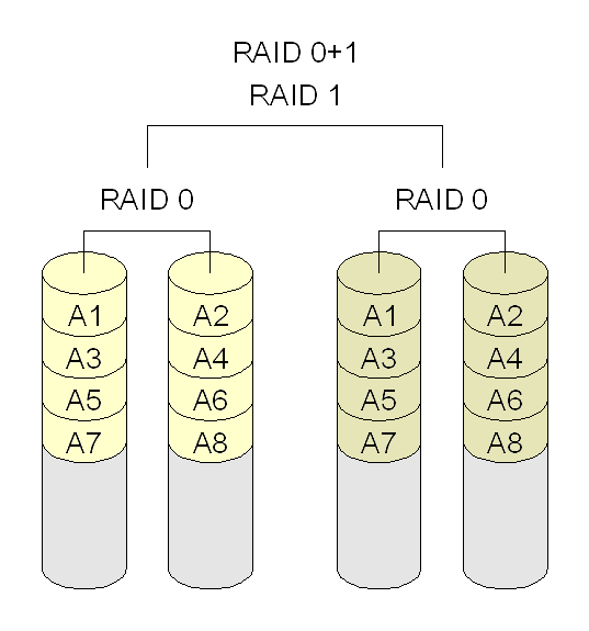 - '''RAID 0+1''': RAID 0으로 스트리핑한 디스크들을 다시 RAID 1으로 미러링한다.