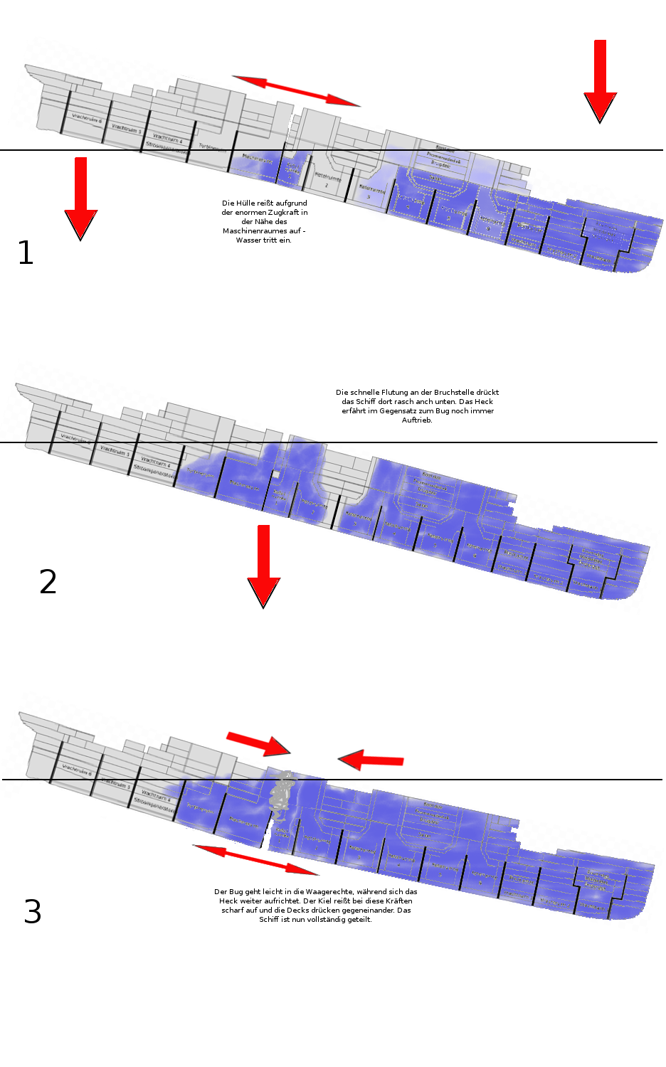 - '''F 갑판''' - 3등실 객실이 대부분이었지만, 2등실 객실과 선원 숙소도 있었다. 3등실 식당, 수영장, 터키탕도 있었다.