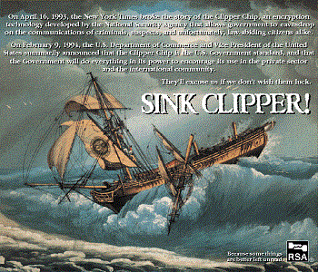 1990년대 중반, RSA는 클리퍼 칩에 반대하는 캠페인을 주도했다. 이 캠페인에는 시민 자유주의자들과 함께 침몰하는 범선(클리퍼) 그림에 "Sink Clipper!(클리퍼를 침몰시켜라!)"라는 문구가 적힌 포스터를 배포하는 것이 포함되었다.[86]