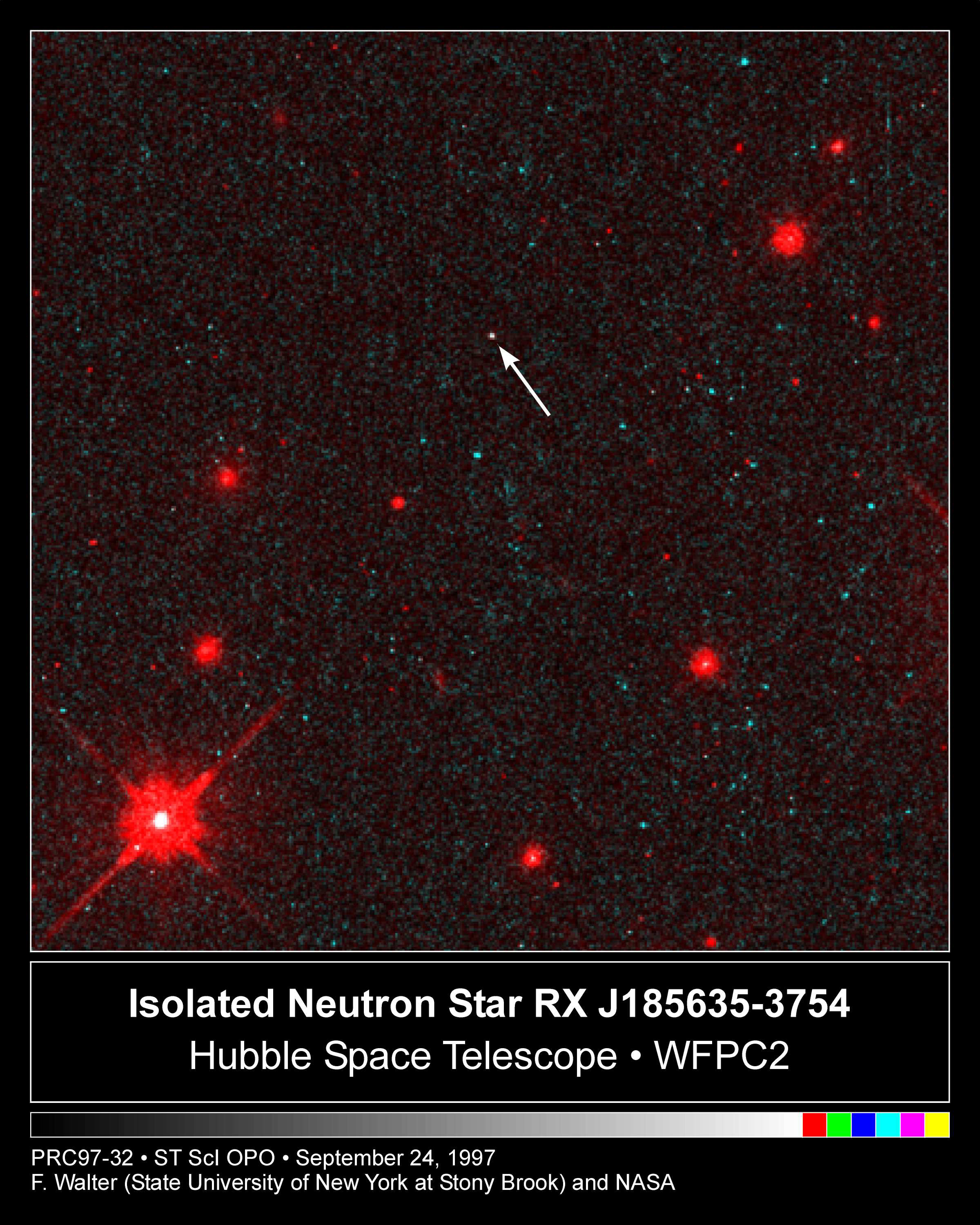 RX J1856.5-3754는 약 백만 년 전 동반성의 초신성 폭발로 만들어졌으며, 초속 108km로 하늘을 가로질러 이동하고 있다.[2] 1992년에 발견되었고, 1996년 관측 결과 지구에서 가장 가까운 중성자별로 확인되었다.[2]