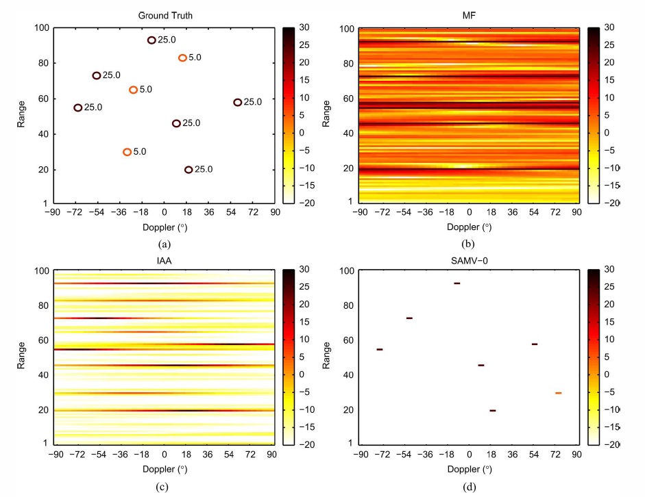 정합 필터 방식은 도플러 및 레인지 영역 모두에서 스미어링(Smearing) 및 누설 효과로 인해 5dB 표적을 구별하기 어렵다. IAA 알고리즘은 향상된 영상 결과를 제공하지만, SAMV-0 방식은 스미어링 효과를 제거하는 대신 5dB의 약한 표적을 놓치는 경우가 있다.[1][5]