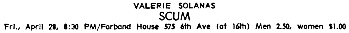 1977년 빌리지 보이스와의 인터뷰에서 솔라나스는 SCUM의 실체에 대해 다음과 같이 밝혔다.[94]