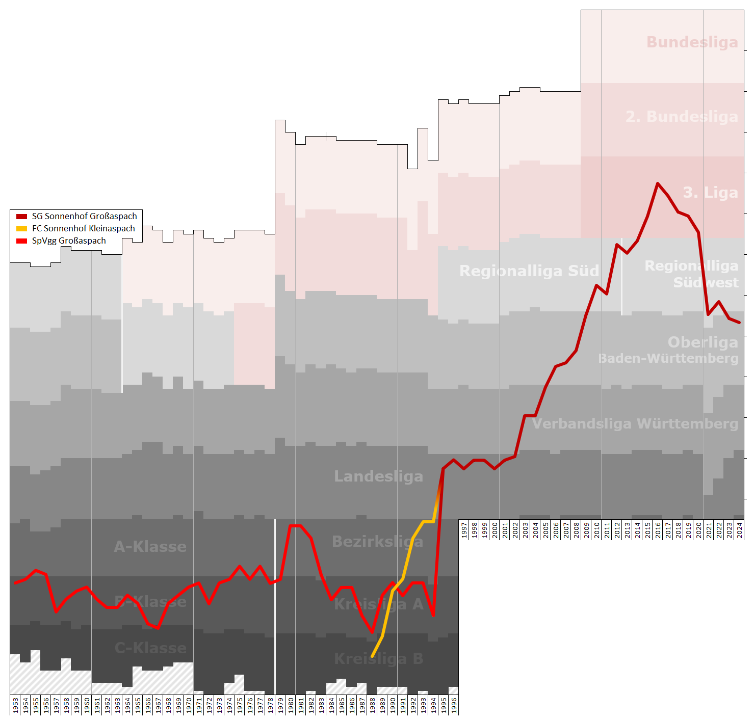 SG 소넨호프 그로스아스파흐는 1994년 ''Spvgg 그로스아스파흐''와 ''FC 소넨호프 클라인아스파흐''의 합병으로 창단되었다.[1] 이 스포츠 클럽은 1,300명의 회원을 보유하고 있으며, 축구 외에도 볼링, 체조, 탁구 부서를 운영하고 있다. 클럽 이름에 사용된 "소넨호프"는 FC 소넨호프 클라인아스파흐가 창단된 회의가 열린 지역 호텔 소넨호프에서 유래되었다.[1]