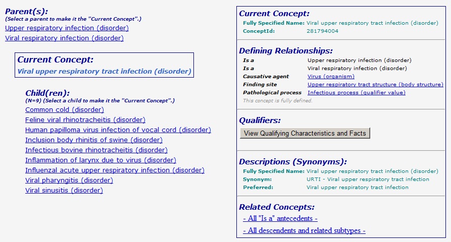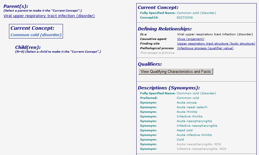 ''Common cold(감기)'' 예에서, concept description은 "primitive"이며, 이것은 각 인스턴스에 대해서 만족해야 하는 필요(necessary) 기준은 주어졌지만 ''Common cold''의 인스턴스로 질환이 분류되는데 충분하지는(sufficient) 않다는 것을 의미한다. 반대로 ''Viral upper respiratory tract infection(바이러스성 상기도감염)''은 다음과 같이 기술논리적으로 fully defined concept(완전히 정의된 개념)로 표현되었음을 보여준다.