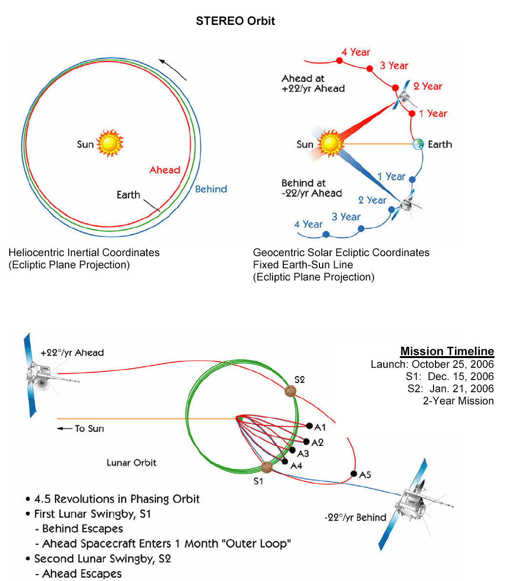 두 대의 STEREO 우주선은 2006년 10월 26일에 발사되어 지구 궤도 안팎에서 태양을 중심으로 공전한다. STEREO-A는 지구보다 태양에 더 가깝고 공전 주기는 347일이다. STEREO-B는 지구보다 태양에서 더 멀리 떨어져 있으며 공전 주기는 387일이다. A 우주선/태양/지구 각도는 연간 21.650° 증가하고, B 우주선/태양/지구 각도는 연간 -21.999° 변경된다.[3] 시간이 지남에 따라 STEREO 우주선은 연간 약 44°의 결합된 속도로 서로 계속 분리된다.2009년 1월 24일, 두 우주선은 90° 분리(사분)를 달성했다. 2011년 2월 6일에는 두 우주선이 정확히 180° 떨어져 있어 처음으로 태양 전체를 한 번에 볼 수 있었다.[3] 2015년에는 STEREO 우주선이 태양 뒤로 지나가면서 몇 달 동안 통신이 두절되기도 했지만, 이후 다시 지구에 접근하기 시작하여 2023년 8월에 가장 가까이 접근했다. STEREO 우주선은 지구 궤도로 다시 진입하지는 않을 것이다.[4]