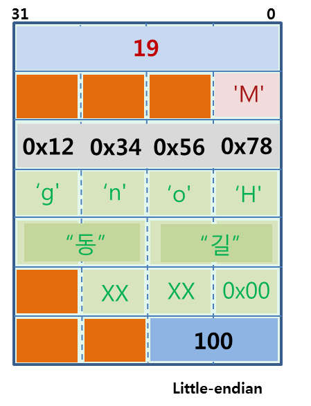 일반적으로 32비트 little-endian CPU로 컴파일하면, `struct` 멤버의 메모리 배치는 위 그림과 같이 된다. 정수형 `int` 사이에 `char` 변수는 4바이트 중 1바이트만 사용하고 나머지 3바이트는 사용하지 않는다. 이는 `id` 변수가 32비트 단위로 접근되어야 하므로 빈 공간을 넣는 방식으로 배치했기 때문이다. 이 `struct`의 크기는 빈 공간(padding bit)까지 포함하여 `sizeof(struct Man) == 28`바이트가 된다.