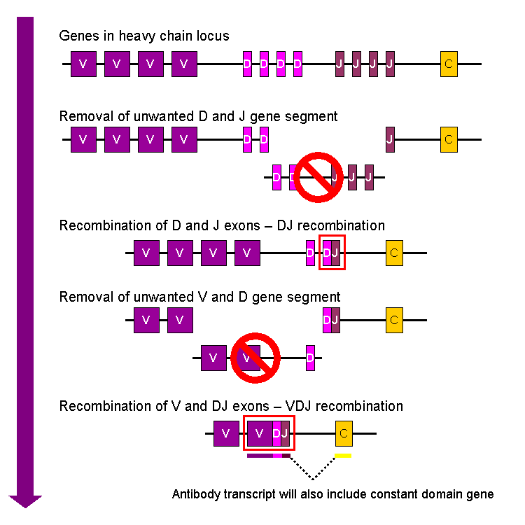 αβ T 세포의 경우, TCR ''알파 사슬''은 VJ 재조합에 의해 생성되는 반면, ''베타 사슬''은 VDJ 재조합에 의해 생성된다. γδ T 세포의 경우, TCR ''감마 사슬''은 VJ 재조합을 통해, ''델타 사슬''은 VDJ 재조합을 통해 생성된다. 이러한 재조합 과정은 모두 유전자 세그먼트의 무작위적인 결합을 포함하여 완전한 TCR 사슬을 생성한다.
