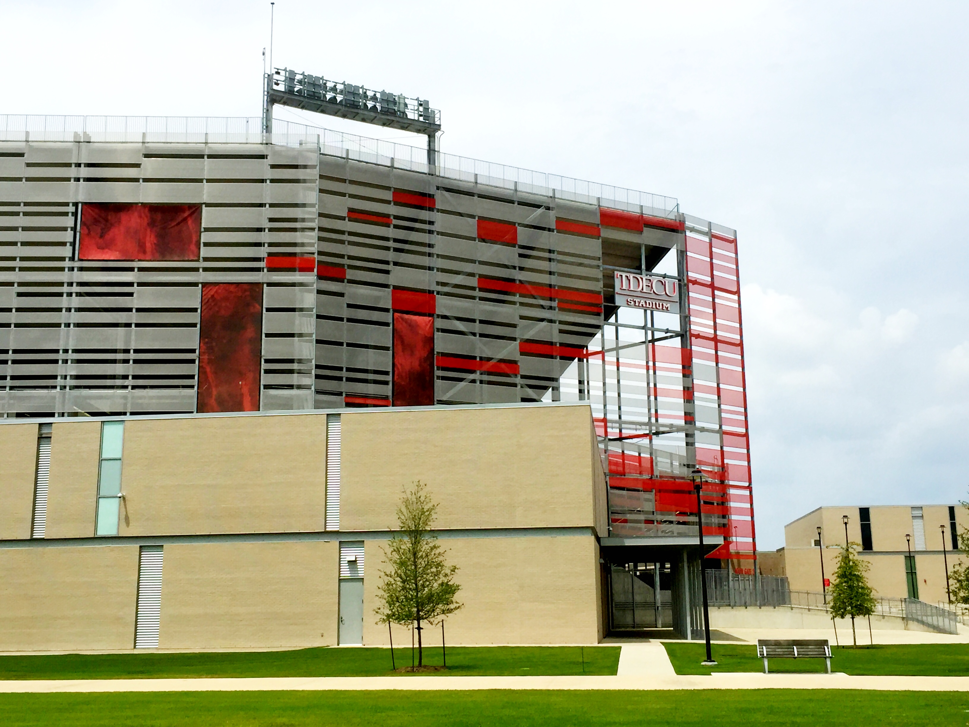 Page와 DLR Group이 공동으로 설계를 맡았으며,[26] 2013년 2월 공식 기공식이 열렸다.[37] 2014년 7월, 텍사스 다우 임직원 신용협동조합(TDECU)이 10년간 1500만달러 규모의 명명권을 획득하면서 경기장 공식 명칭은 'TDECU 스타디움'이 되었다.[30][31] 경기장은 2014년 미식축구 시즌 개막에 맞춰 완공 및 개장했고, 이후 건축 및 디자인 분야에서 여러 상을 수상하며 그 가치를 인정받았다.[42][43][44][45]