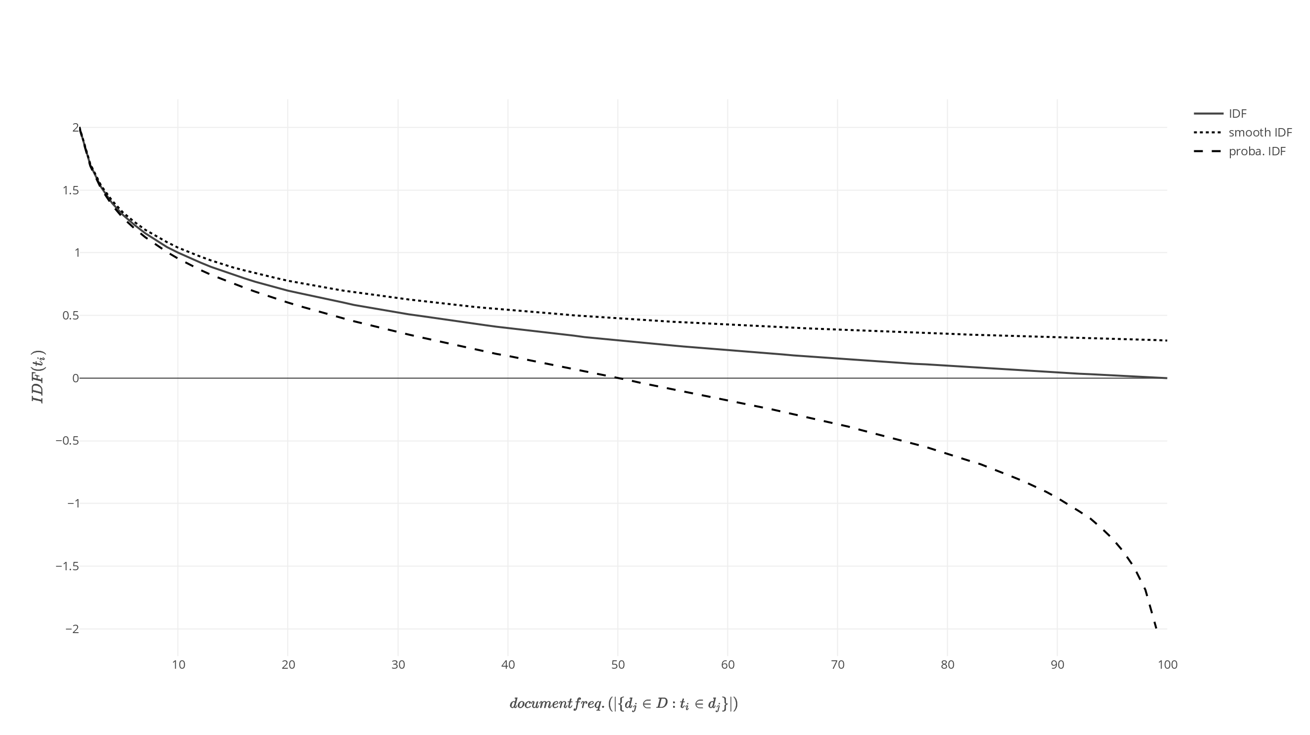 - 로그 스케일 빈도: tf(t,d) = log (1 + f(t,d)). 단어 빈도수의 절대적인 차이보다는 상대적인 중요도를 반영한다.[6]