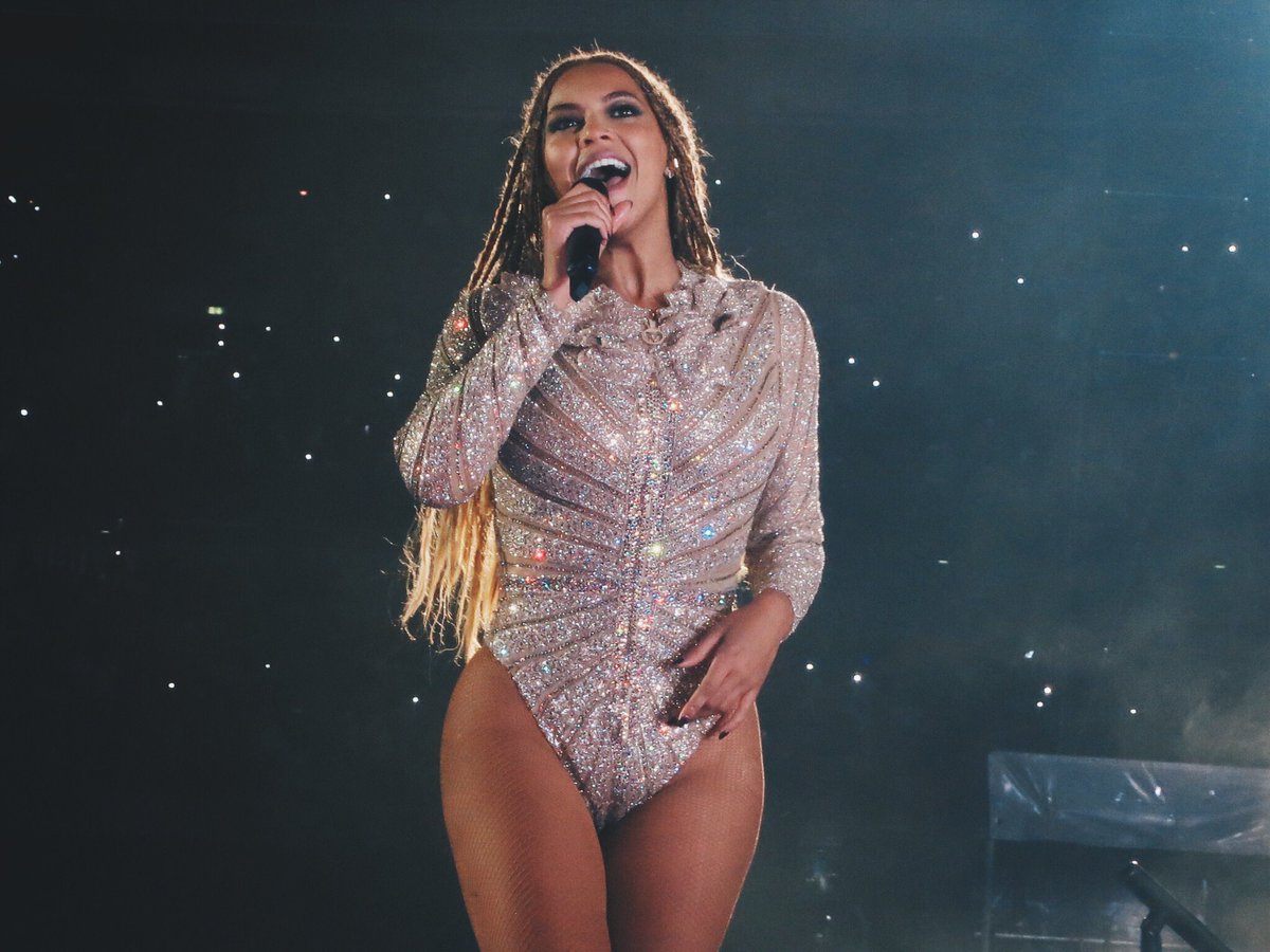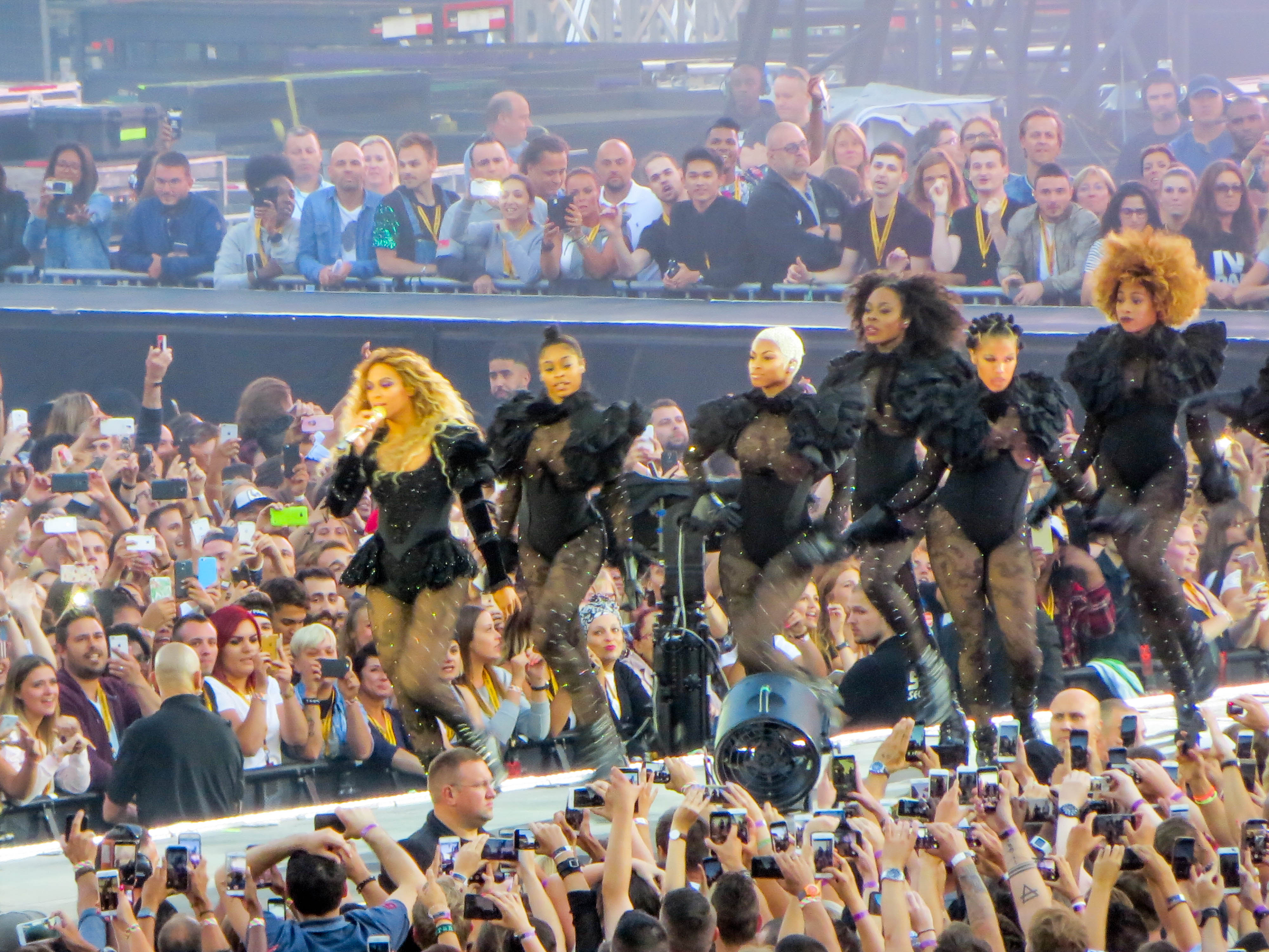 런던 웸블리 스타디움에서 열린 두 번의 공연 중 두 번째 공연을 하는 비욘세. 첫 번째 공연은 30분도 안 되어 매진되어 추가되었다.