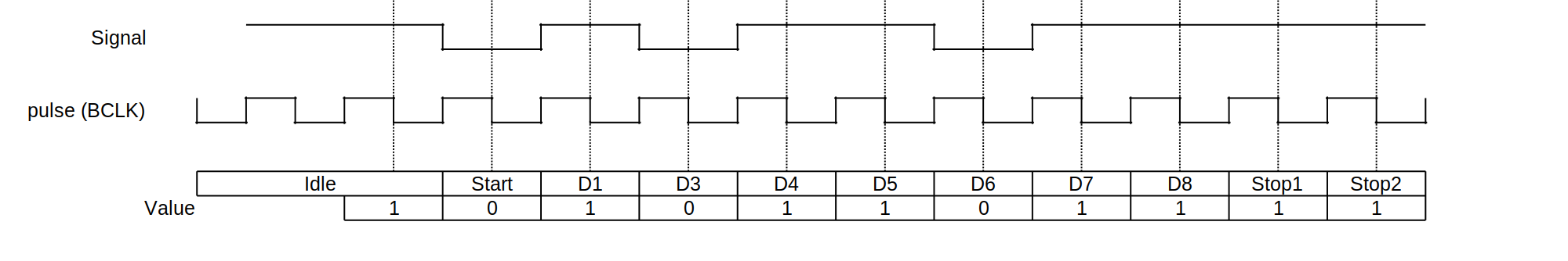 일반적으로 각 데이터 비트의 경계는 시작 비트를 기준으로 16/64배 빠른 클럭 신호를 이용하여 찾아낸다. 이 클럭 신호는 내부 클럭 디지털 회로에서 발생하며, 보드 설정에 따라 주 클럭으로부터 타이머 등을 이용하여 설정된 속도의 클럭 신호를 생성한다. 통신 양쪽은 미리 설정을 약속하고 클럭 신호 발생부의 레지스터를 같은 속도로 설정해야 원활한 통신이 가능하다.