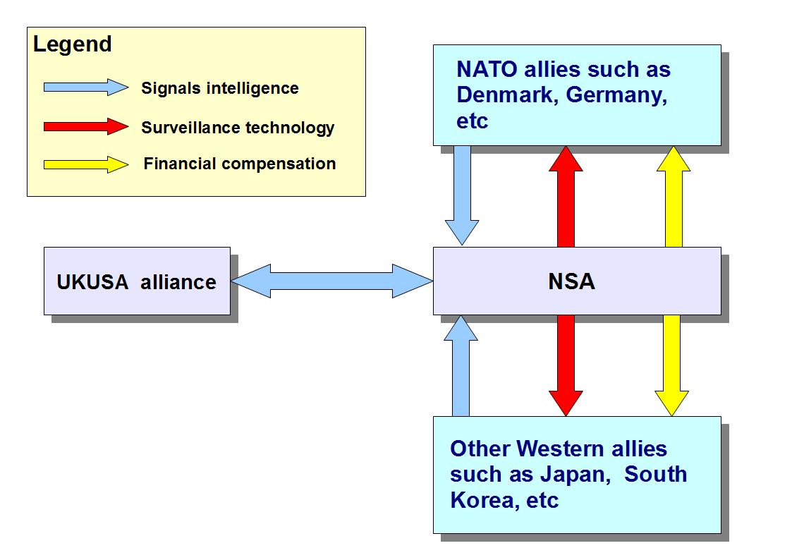 영국과 미국 동맹국 간의 상호 감시 및 정보 공유 문제는 2013년 대량 감시 폭로를 통해 다시 한번 주목받았다. 독일 뉴스 잡지 ''슈피겔''은 이러한 협력이 각국의 국내 감시 규제를 회피하기 위해 이루어진다고 설명했다.
