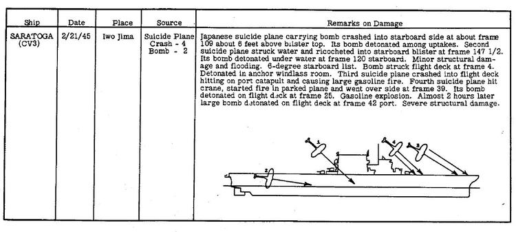 2월 16일과 17일 밤, 기동부대는 일본 본토를 공습했다. 2월 21일, 새러토가는 이오지마의 야간 방공과 지치지마에 대한 야간 공격 임무를 위해 구축함 3척과 함께 기동부대를 떠났으나, 일본 해군 제2어 방패대의 가미카제 특공 공격을 받아 대파되었다. 이 공격으로 123명이 사망 또는 실종되고 192명이 부상당했다.