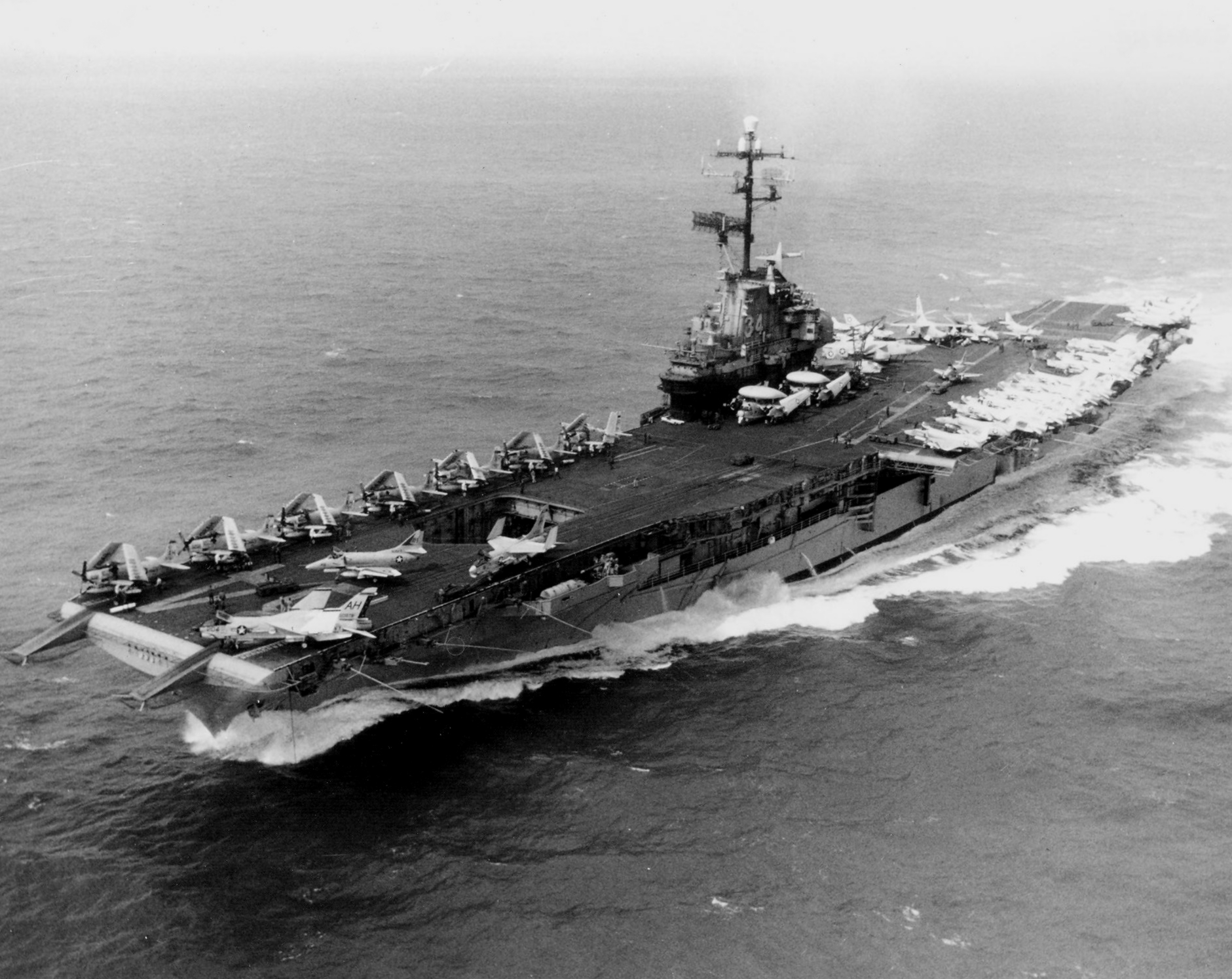 1965년부터 베트남 전쟁에 참전하여 남베트남 지원 및 북베트남 공습 작전을 수행하였다. 1966년 10월 26일, 대규모 화재 사고가 발생하여 44명이 사망하고 16명이 중경상을 입었으며, 항공기 6대가 손실되었다. 화재 사고 이후에도 지속적인 작전을 수행, 1967년에는 존 매케인이 탑승하기도 했다. 1968년 1월, 북베트남 상공에서 122일간의 전투 작전을 수행하였다.
