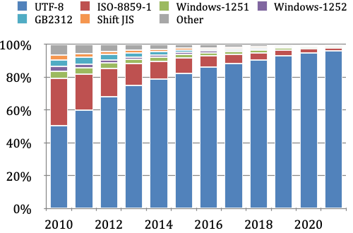 UTF-8은 2008년부터 월드 와이드 웹에서 가장 흔하게 사용되는 인코딩 방식이 되었다.[23]