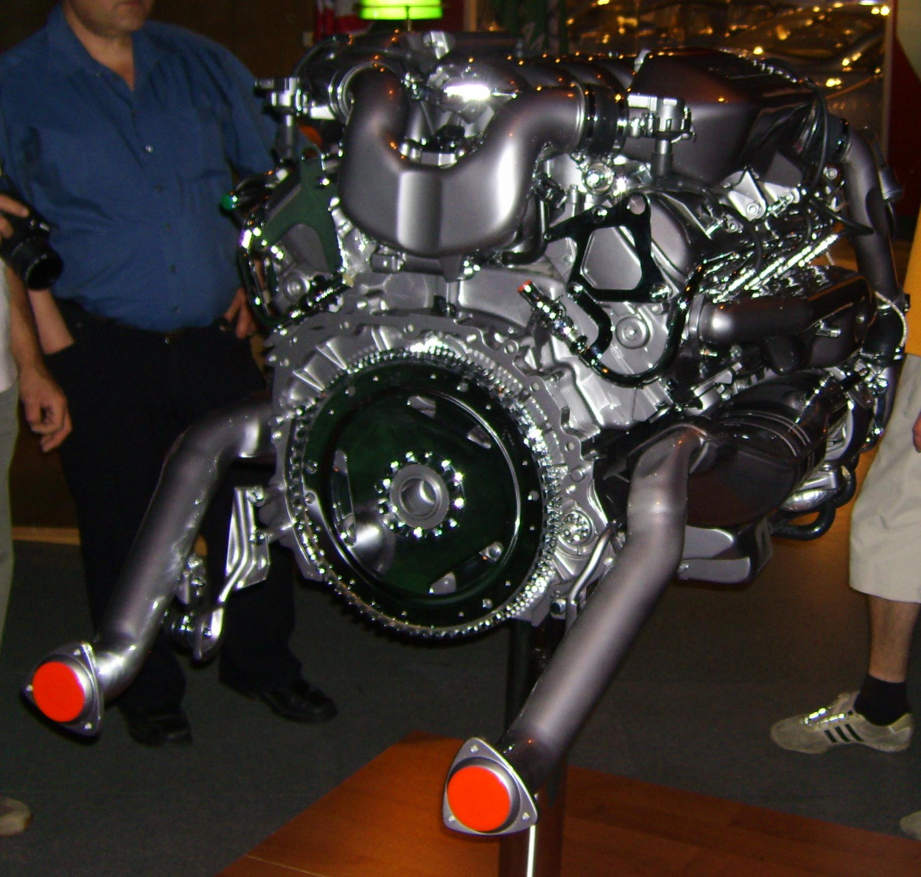 시판 승용차에서 V형 8기통을 채용한 최초는 프랑스의 드 디옹 부통으로, 1909년의 일이었다. 그러나 그 엔진은 가공 정밀도와 흡배기 계통의 설계에 어려움이 있는 불량품 엔진으로, 6 L의 배기량이 있음에도 불구하고, 당시로서는 그다지 고출력이라고 할 수 없는 50hp을 발생시킬 뿐이었다. V형 8기통은 직렬 4기통 2조가 1개의 크랭크를 공유하는 레이아웃이며, 양 뱅크 상호 간의 밸런스나 마찰 억제의 관점에서도 블록의 가공 정밀도는 직렬 6기통 엔진을 뛰어넘는 수준을 요구한다.