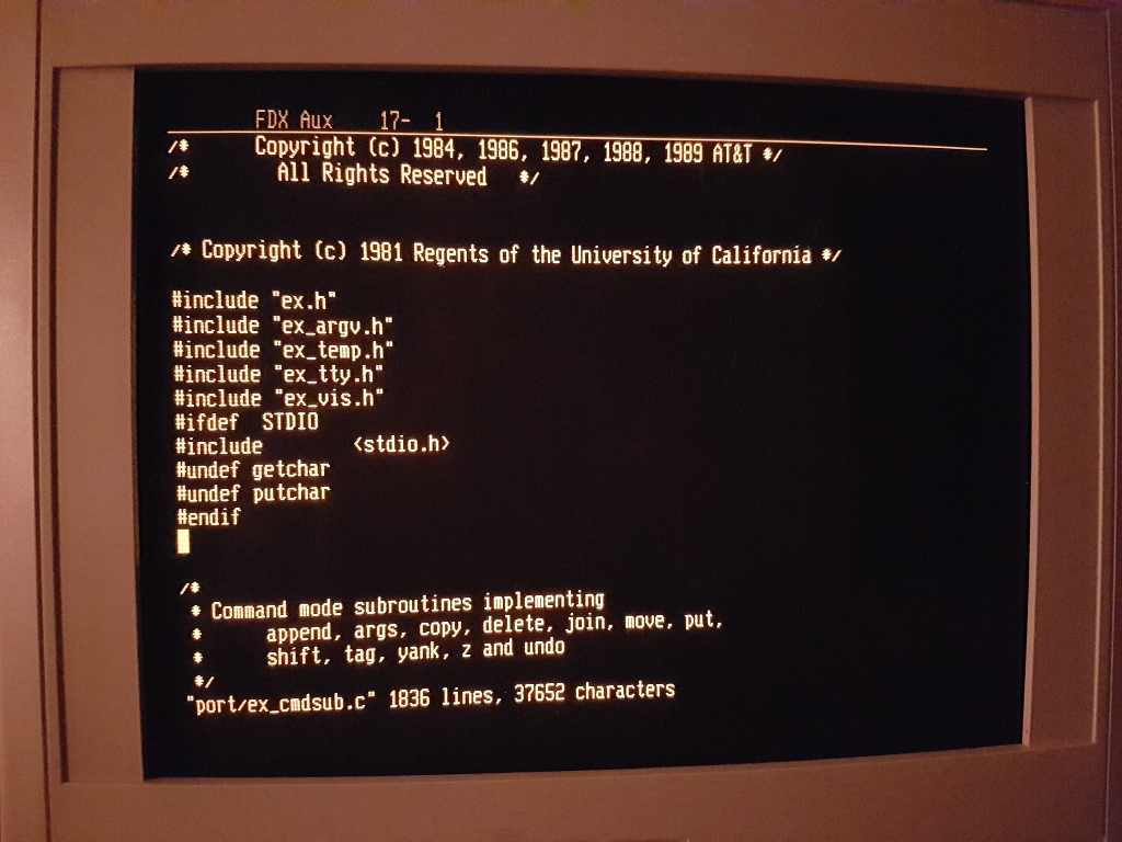 빌 조이에 따르면 ex 2.0(vi)은 PDP-11/70의 메모리에 간신히 들어갈 정도로 당시로서는 매우 큰 프로그램이었다.[18] 1979년 12월 3BSD와 함께 제공된 버전 3.1은 PDP-11의 메모리에 더 이상 들어가지 못했고,[19] 1984년에는 IBM PC용 PC/IX에서도 실행하기에 너무 큰 프로그램이었다.[20]