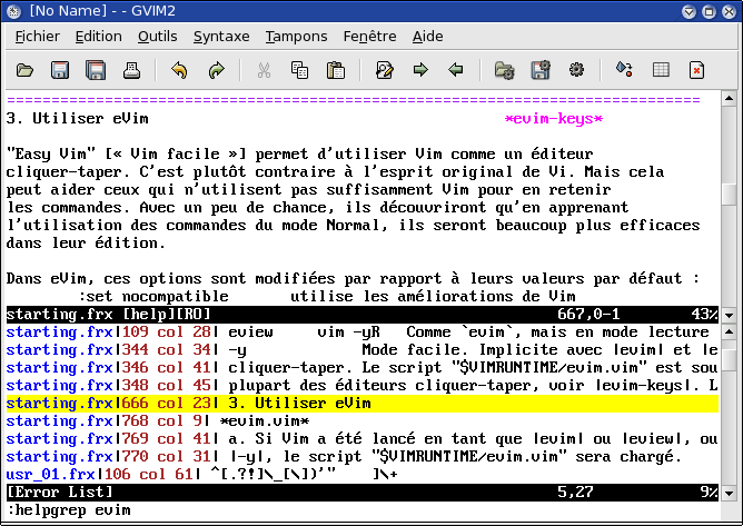 :helpgrep evim. 아래는 검색된 위치이고, 위는 선택된 위치에 대한 도움말 텍스트이다.